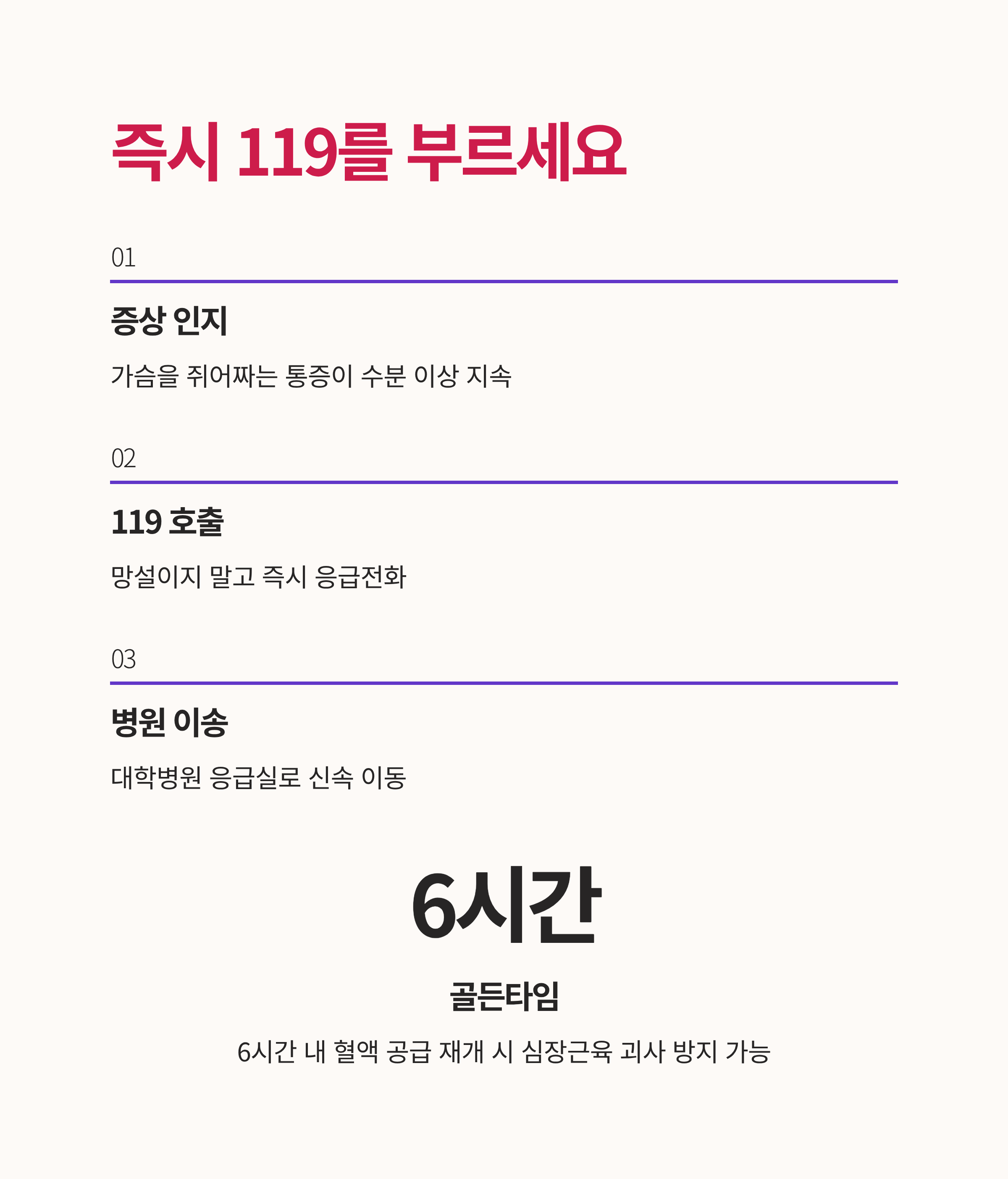 평소 생활하던 중 갑자기 가슴을 쥐어짜는 통증이 수분 이상 지속된다면 망설이지 말고 즉시 119를 불러 대학병원 응급실로 가야 합니다.