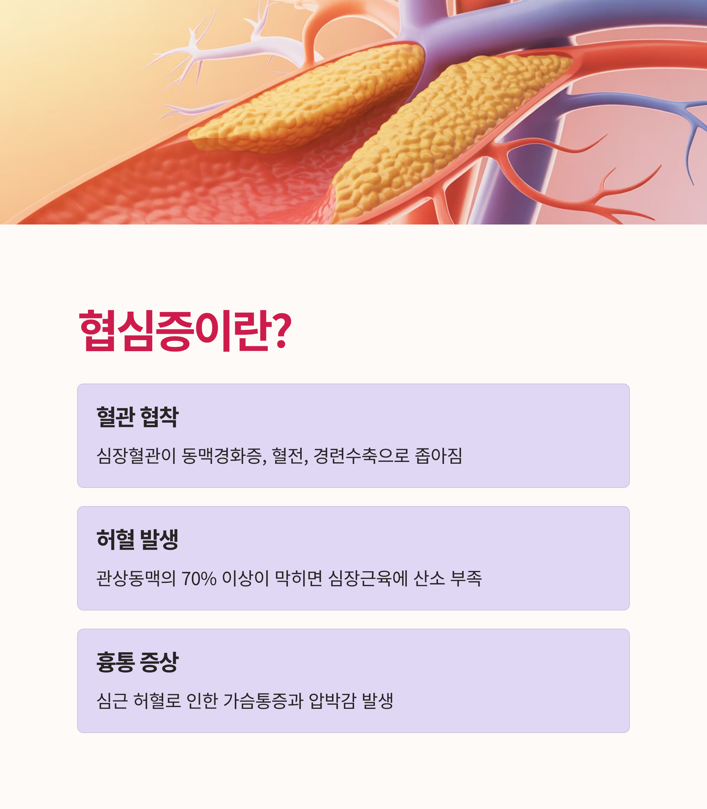 협심증은 심장혈관이 동맥경화증, 혈전, 경련수축 등으로 협착되어 심근에 허혈이 생기면서 나타나는 질환입니다. 관상동맥의 70% 이상이 막히면 심장근육이 허혈 상태에 빠지게 되어 흉통 등의 증상을 일으킵니다.