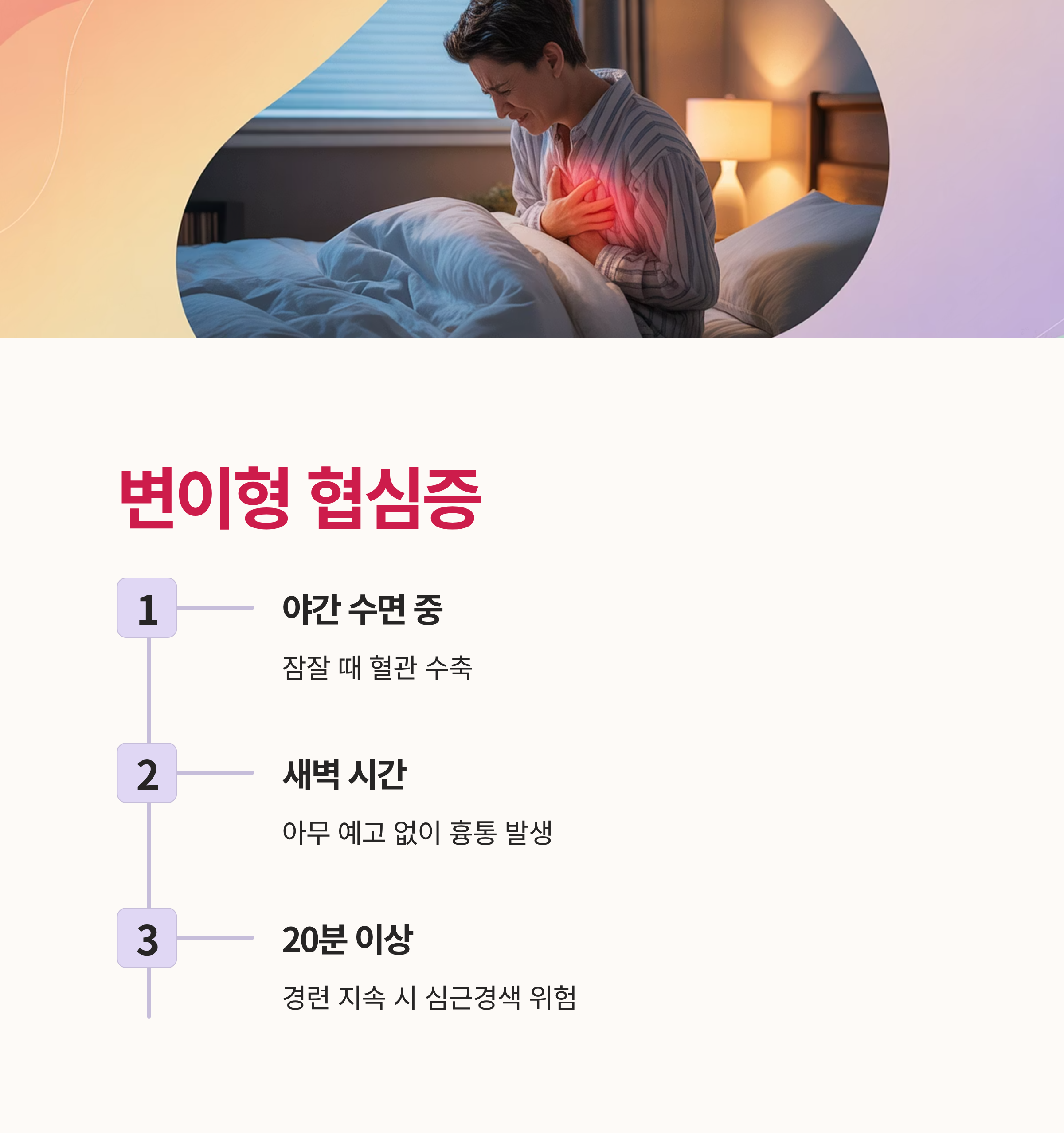잠잘 때, 특히 새벽에 혈관이 수축하여 통증이 생깁니다. 아무 예고 없이 야간 수면 중이나 새벽에 흉통이 발생하며, 혈관 경련이 20분 이상 지속되면 급성 심근경색증으로 진행되기도 합니다.