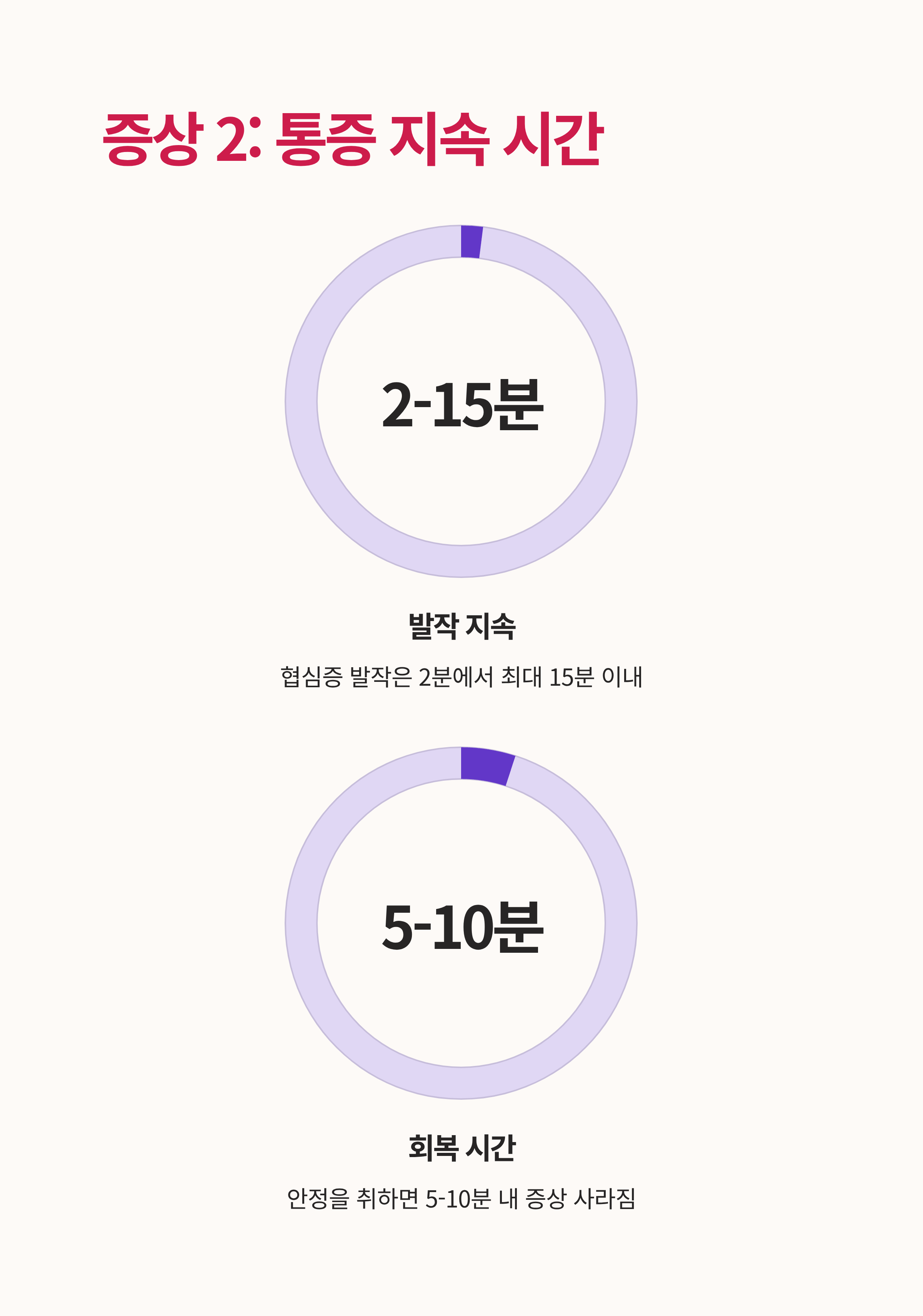 협심증 발작은 1~2분에서 길게는 15분 이내로 지속됩니다. 안정을 취하면 5~10분 이내에 증상이 사라지는 것이 특징입니다.