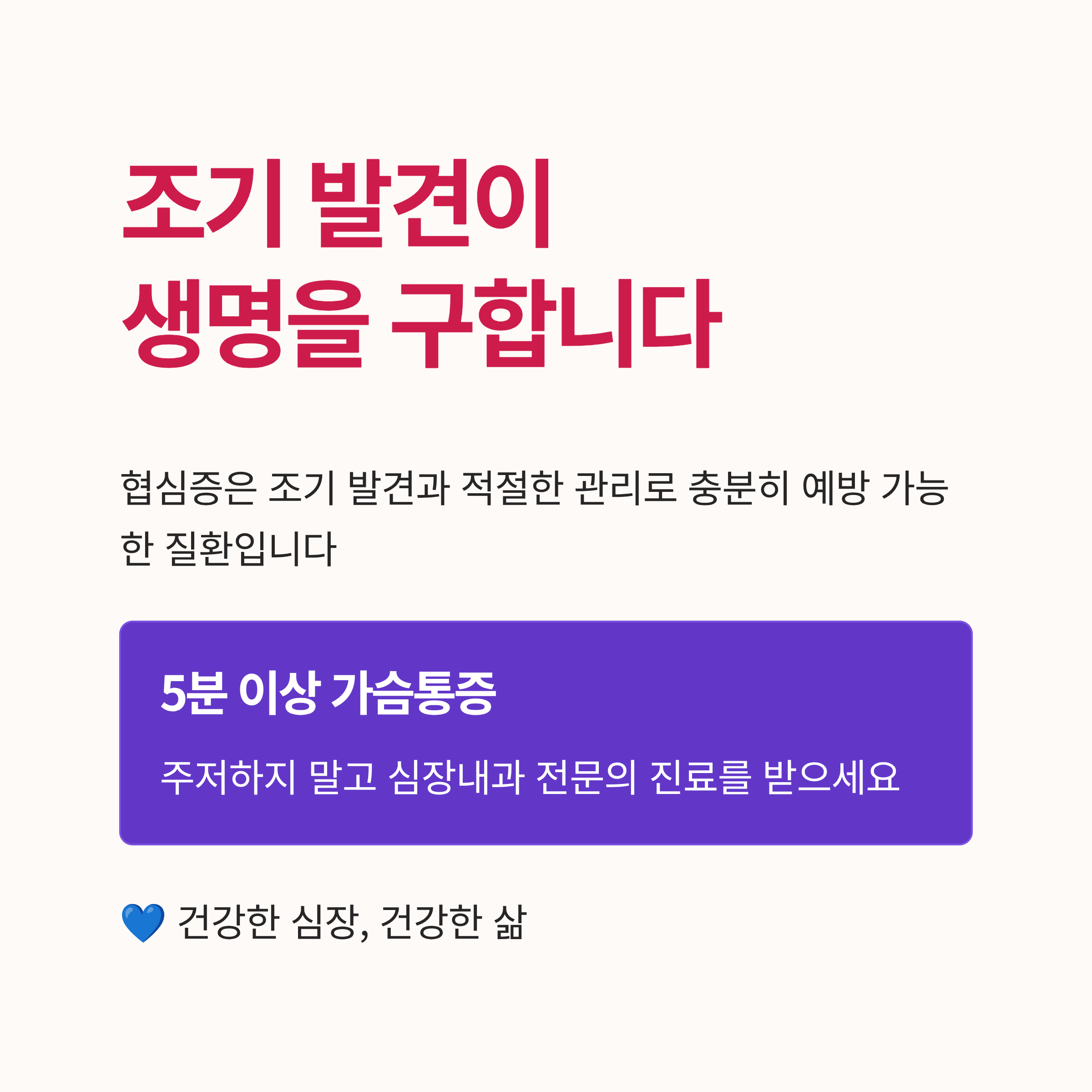 협심증은 조기 발견과 적절한 관리로 충분히 예방 가능한 질환입니다. 위에서 언급한 초기증상이 나타난다면 주저하지 말고 심장내과 전문의의 진료를 받으시기 바랍니다.