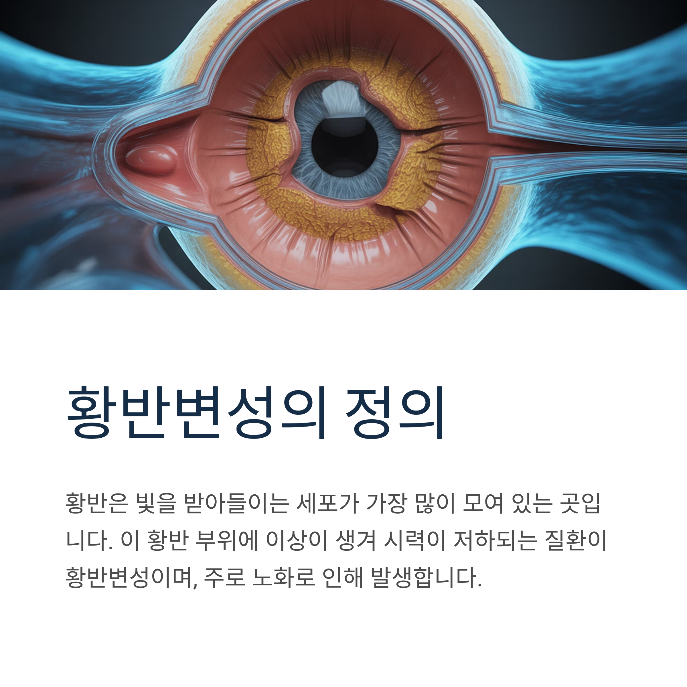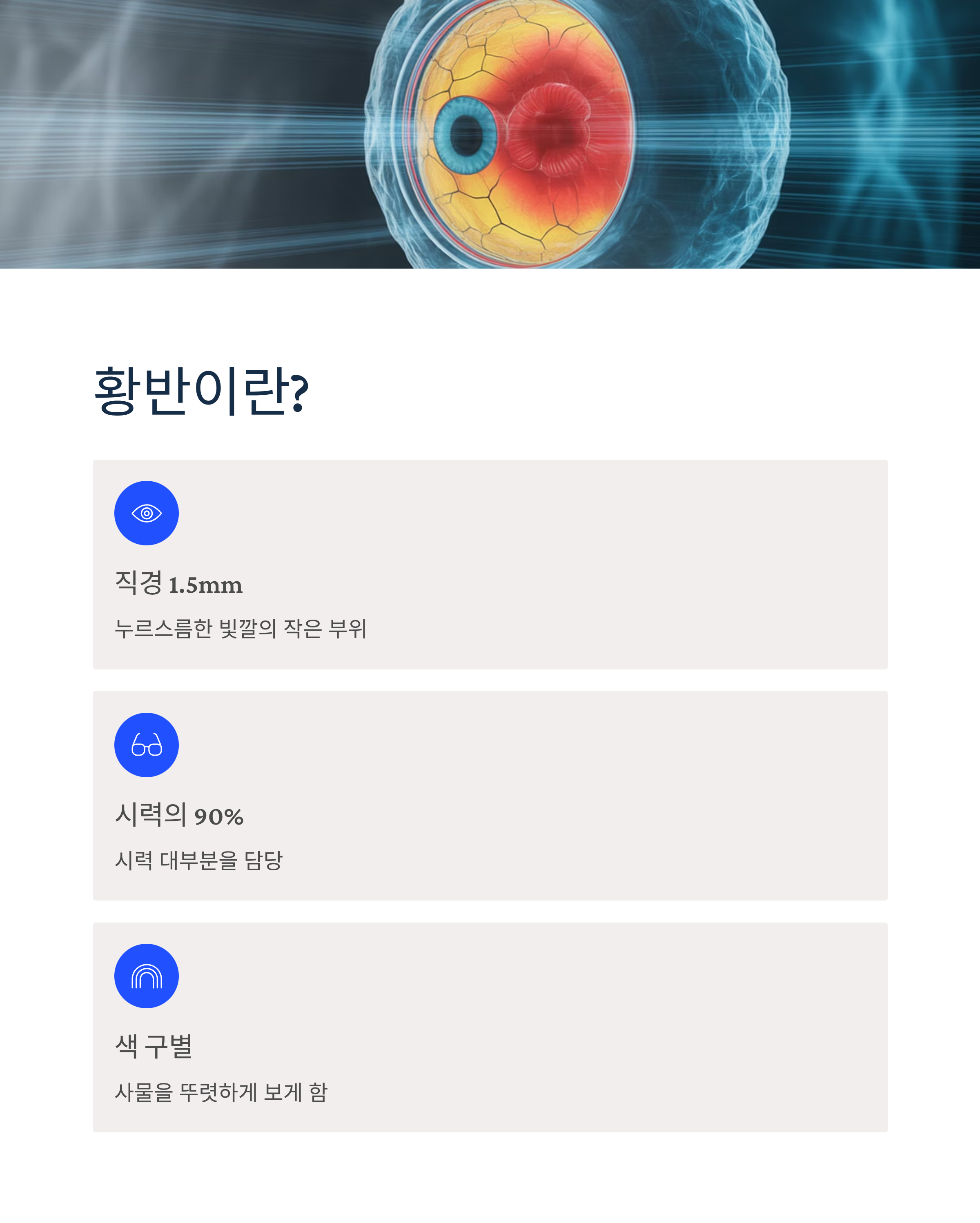 황반은 빛을 받아들이는 세포가 가장 많이 모여 있는 곳으로 직경 약 1.5mm에 누르스름한 빛깔을 띠며, 시력의 90%를 담당하고 색을 구별하고 사물을 뚜렷하게 보이게 하는 역할을 합니다. 이 황반 부위에 이상이 생겨 시력이 저하되는 질환이 황반변성이며, 주로 노화로 인해 발생합니다.