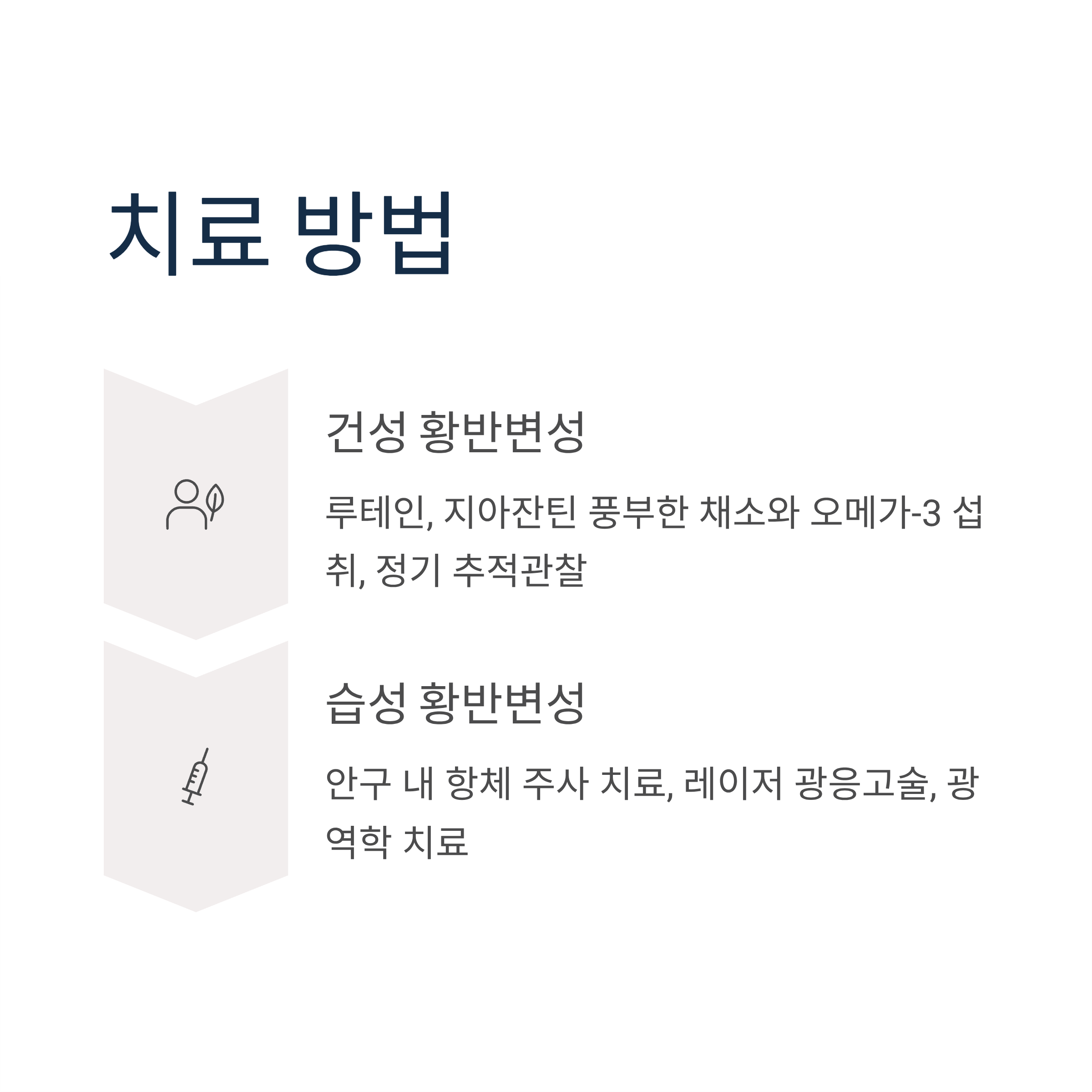 안구 내 항체 주사 치료가 주로 이루어지며, 경우에 따라 레이저 광응고술이나 광역학 치료를 시행합니다.