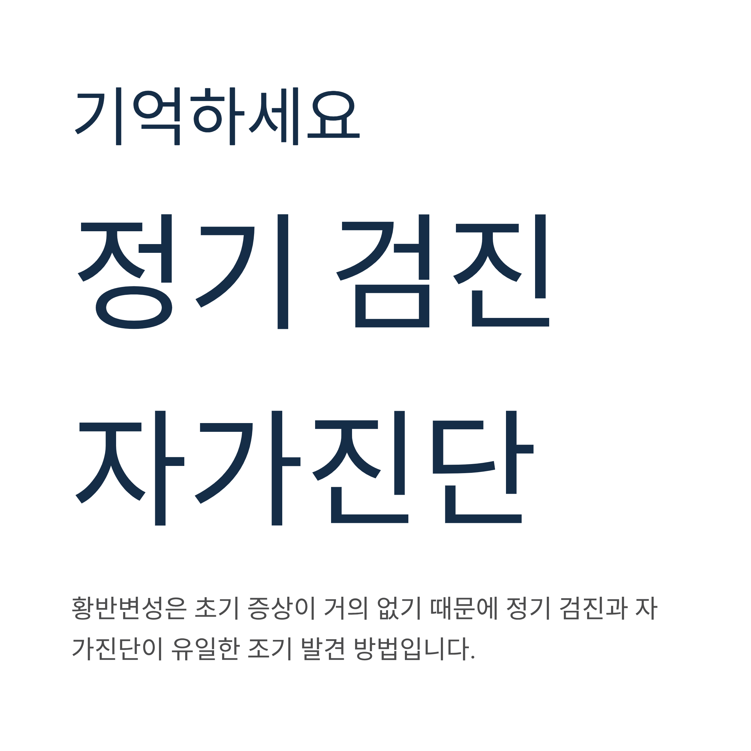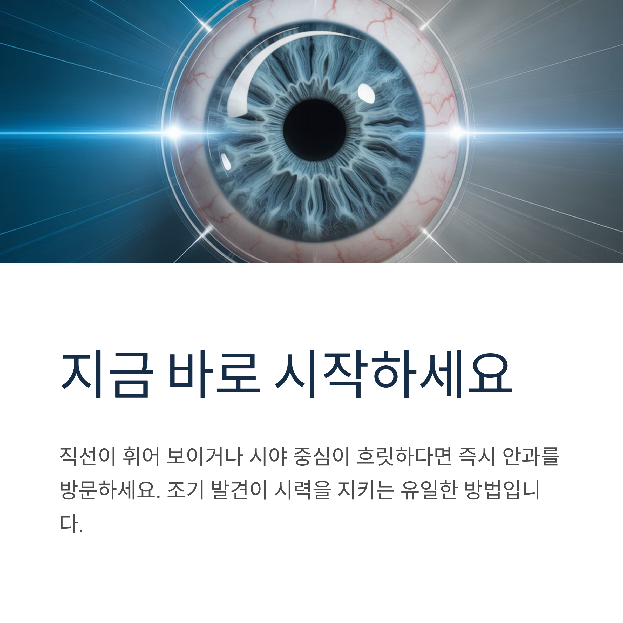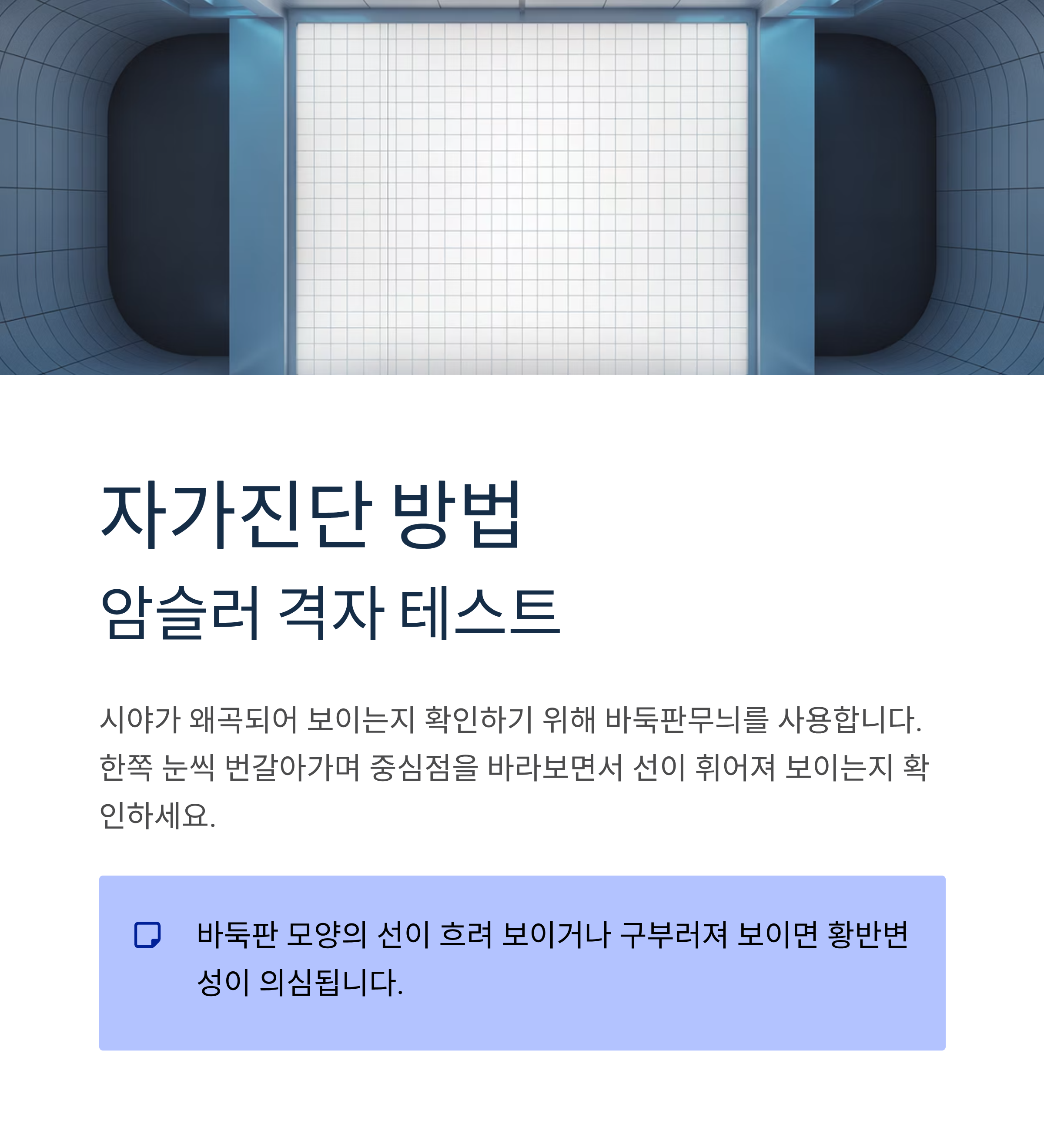 황반변성은 초기 증상이 거의 없기 때문에 정기 검진과 자가진단이 유일한 조기 발견 방법입니다. 60세 이상이라면 1년에 한 번 안과 검진을 받고, 집에서 암슬러 격자 테스트를 주기적으로 실시하는 것이 시력을 지키는 가장 확실한 방법입니다.