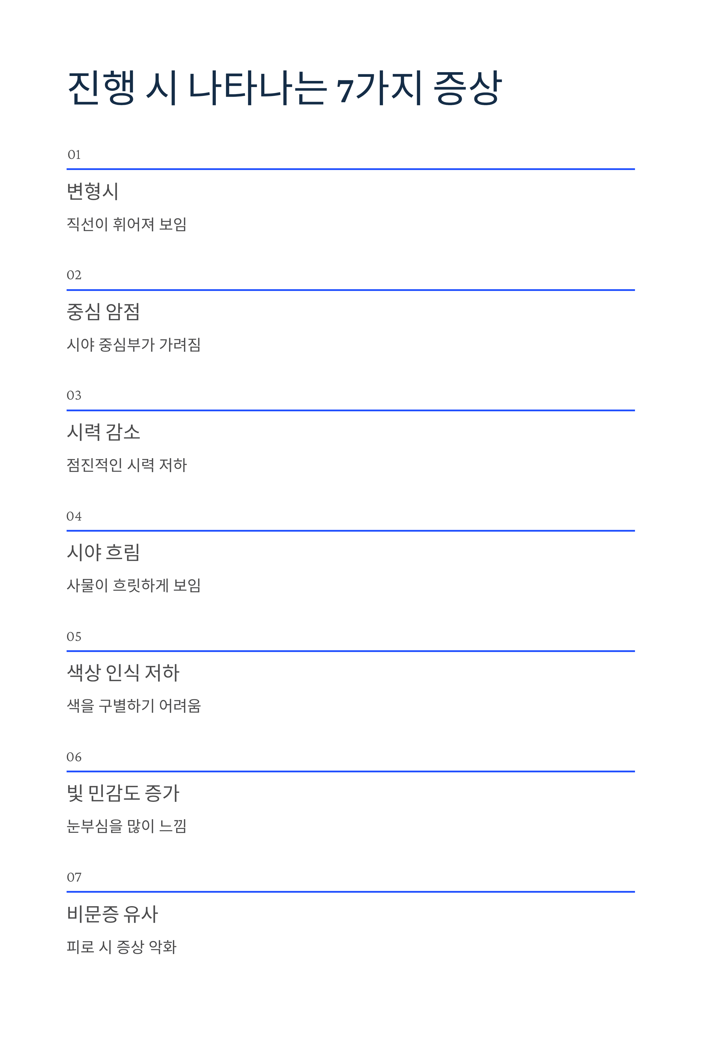 황반변성은 완치가 어려운 안과 질환이지만, 조기에 발견하면 위험인자를 줄일 수 있고, 발병 후에라도 잘 관리하면 시력저하 속도를 최대한 늦출 수 있습니다.
