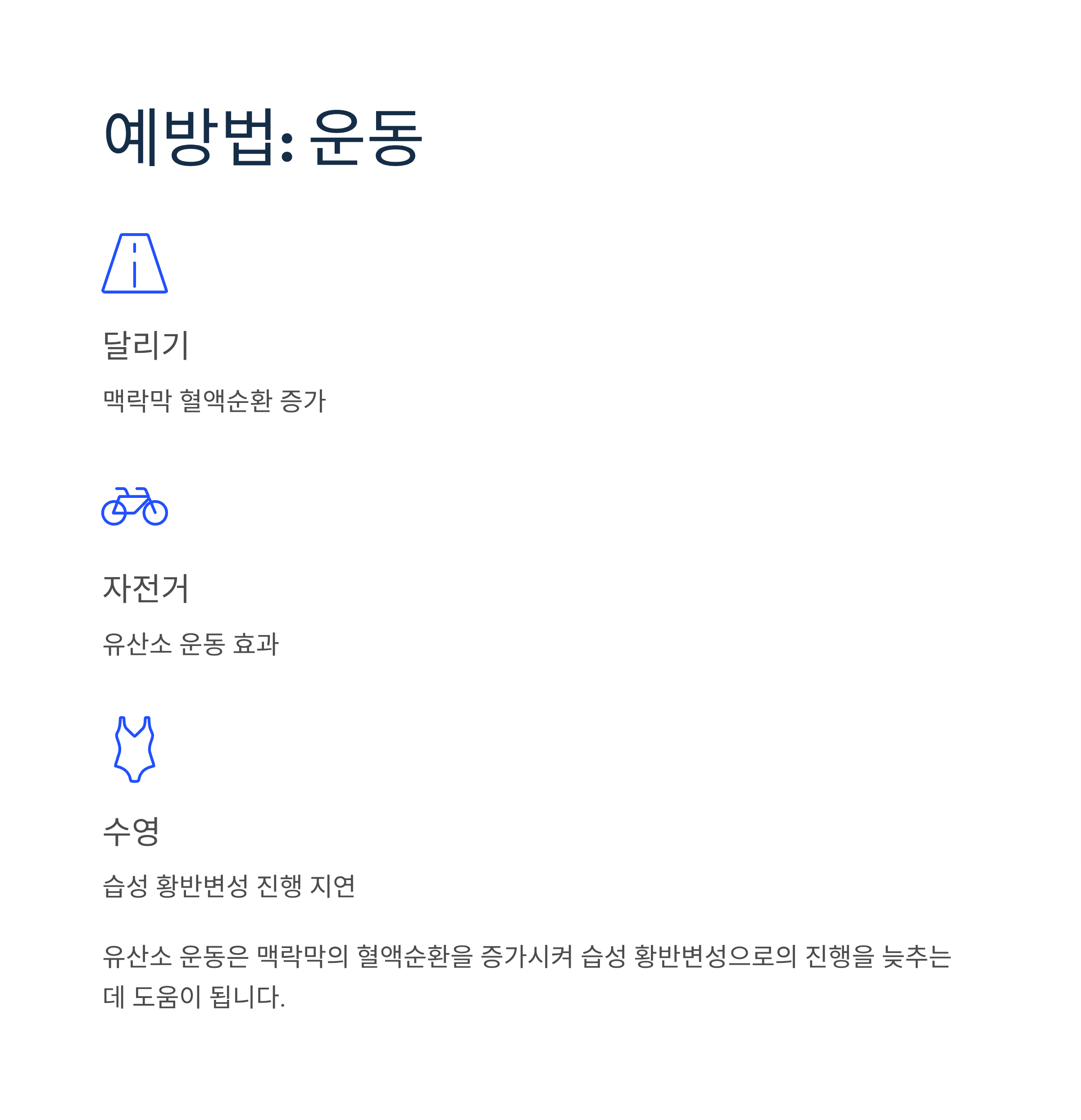 - 유산소 운동: 달리기, 자전거, 수영 등은 맥락막의 혈액순환을 증가시켜 습성 황반변성으로의 진행을 늦추는 데 도움이 됩니다