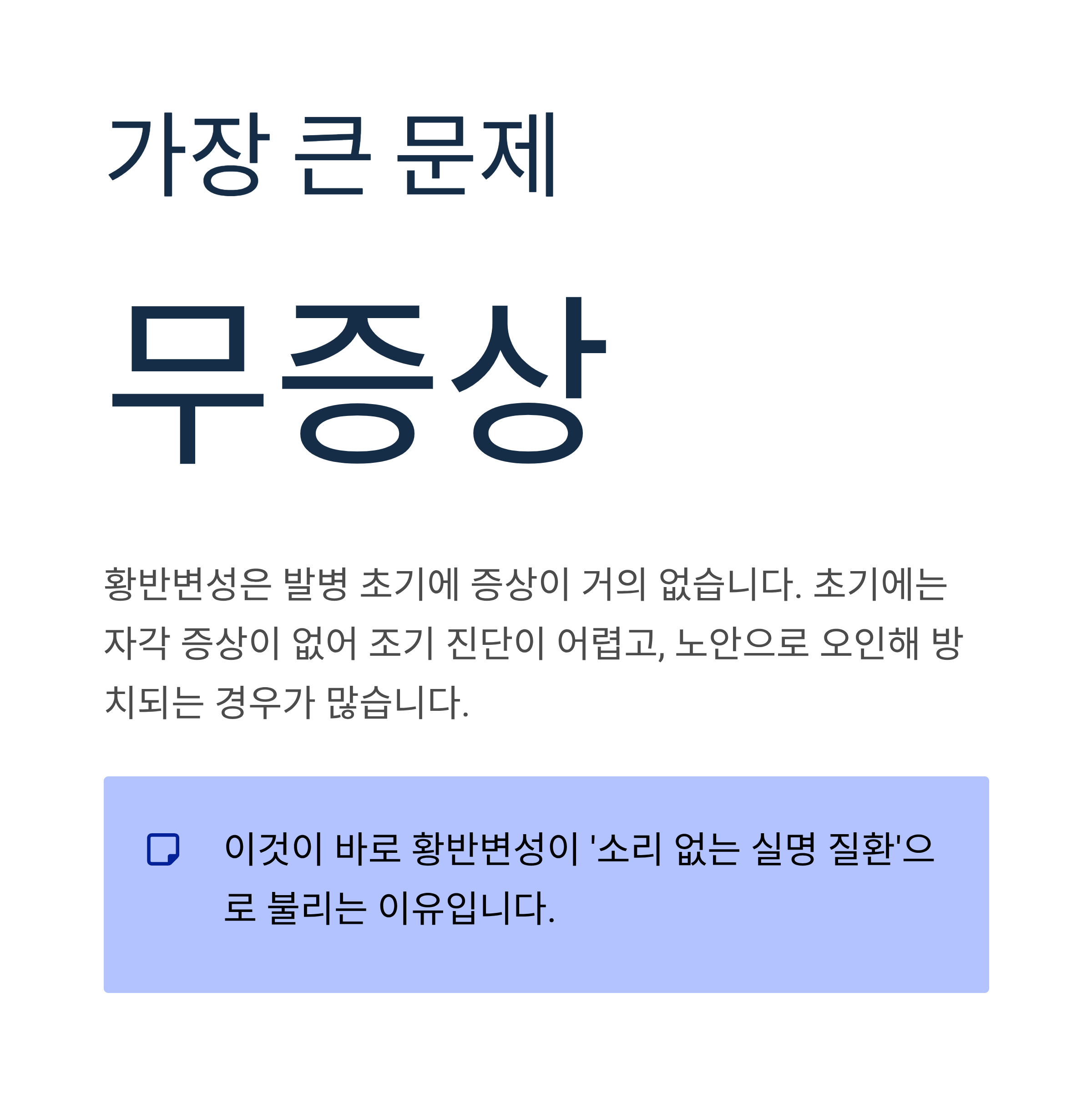 안타깝게도 황반변성은 발병 초기에 증상이 거의 없는 편입니다. 초기 황반변성은 자각 증상이 거의 없어 조기 진단이 어렵고, 노안으로 오인해 방치되는 경우가 많습니다. 이것이 바로 황반변성이 '소리 없는 실명 질환'으로 불리는 이유입니다.