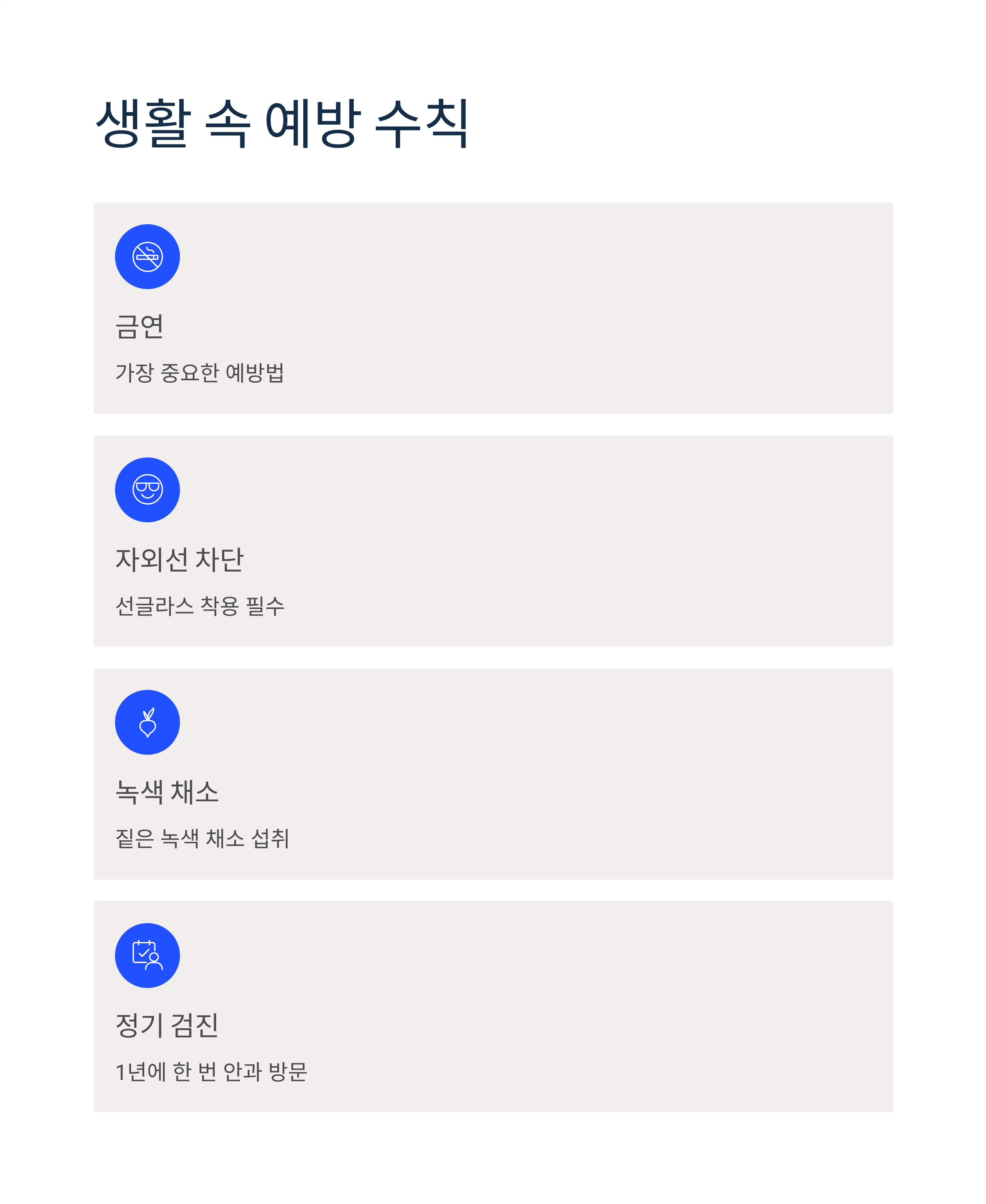 - 정기 검진: 60세 이상은 1년에 한 번 안과 검진을 받으세요
