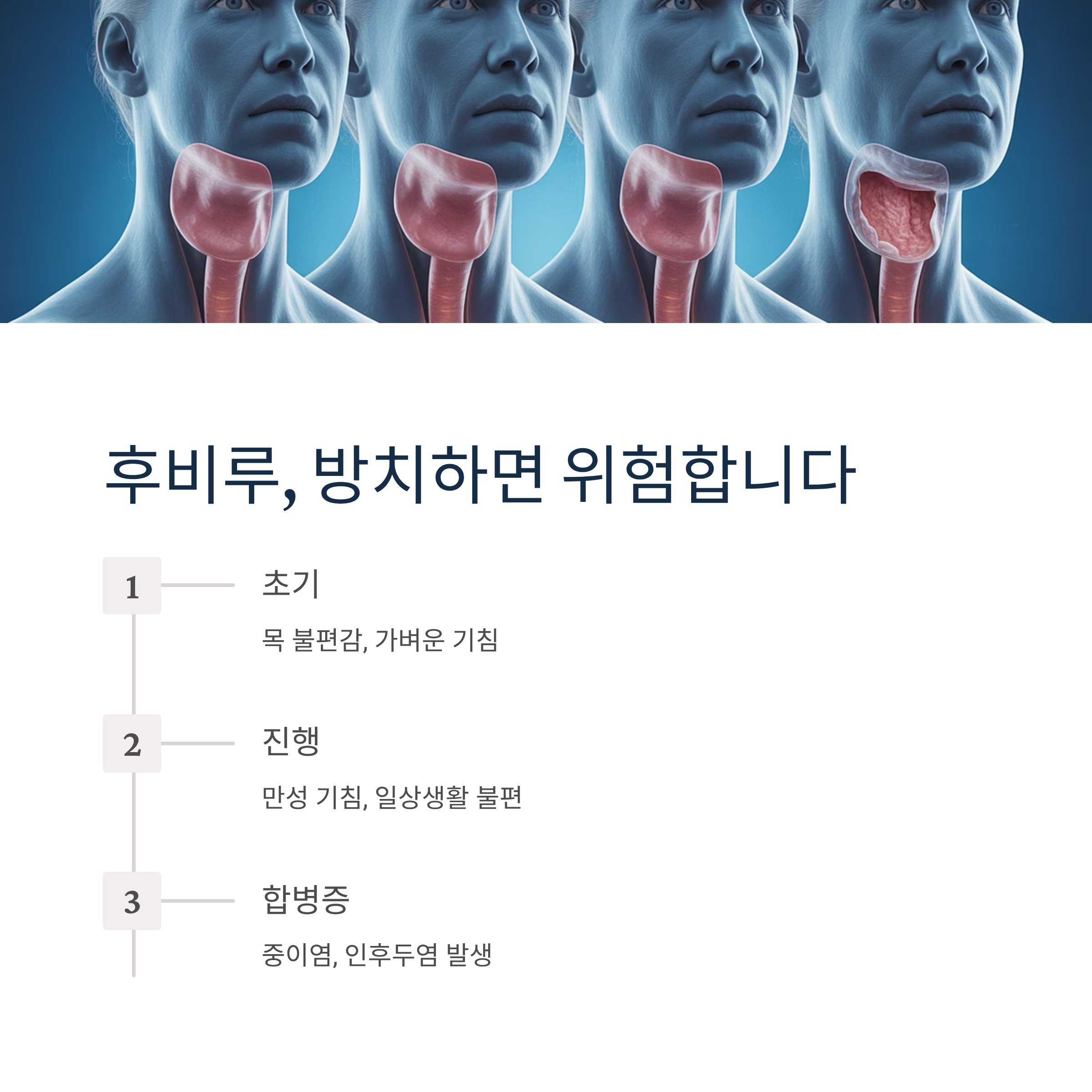 주요 증상: 지속적으로 목 뒤로 점액이 넘어가는 느낌, 만성 기침, 목에 점액이 고여 있는 듯한 이물감, 반복적인 헛기침이 있으며, 증상이 심한 경우 인후통과 호흡 불편함까지 나타납니다.