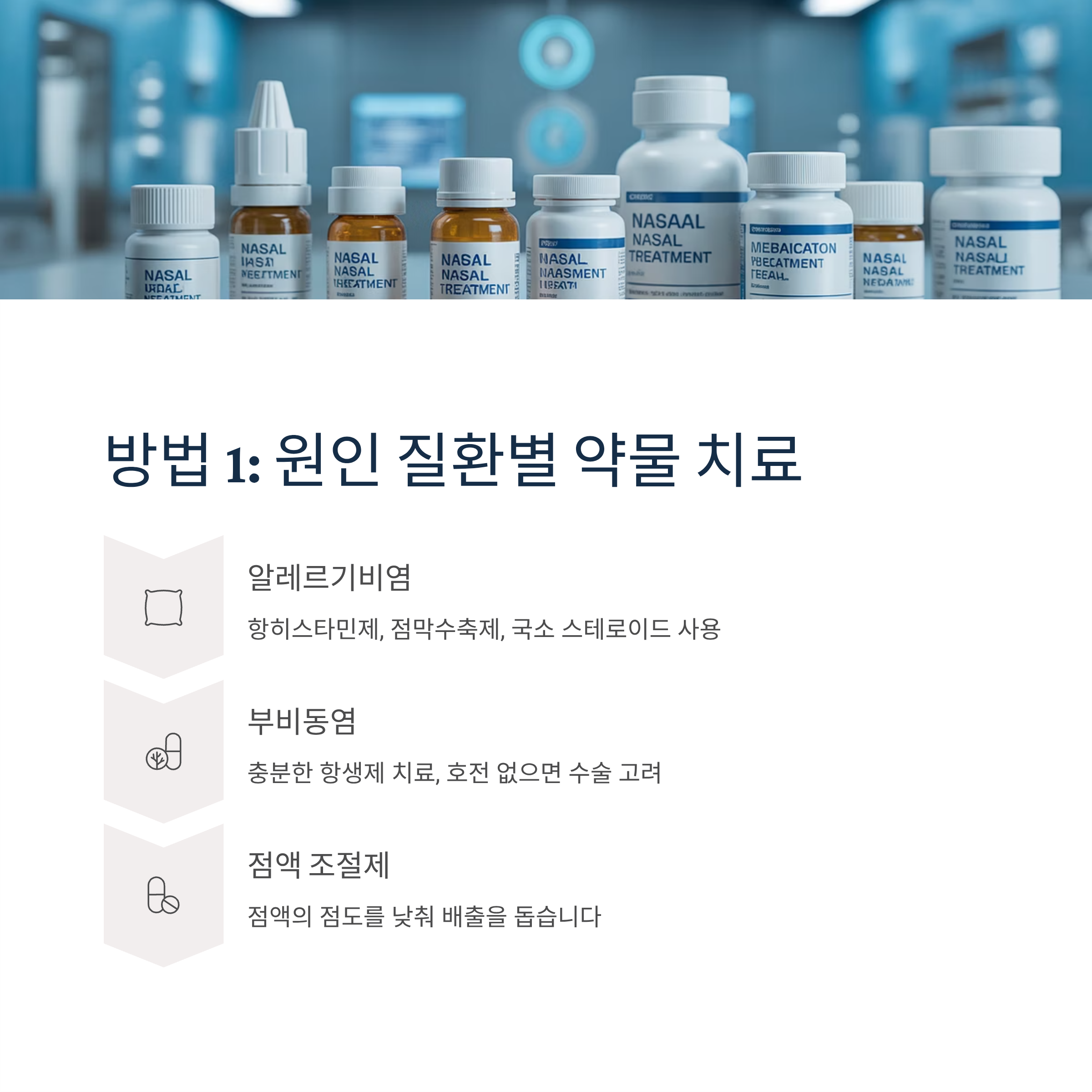 알레르기비염이 있는 경우 항히스타민제, 점막수축제, 국소 스테로이드를 사용하며, 부비동염이 있는 경우 충분한 항생제 치료 후 호전이 없으면 수술적 치료를 고려합니다. 비진정성 항히스타민제 사용이 권장되며, 점액 조절제는 점액의 점도를 낮춰 배출을 돕습니다.