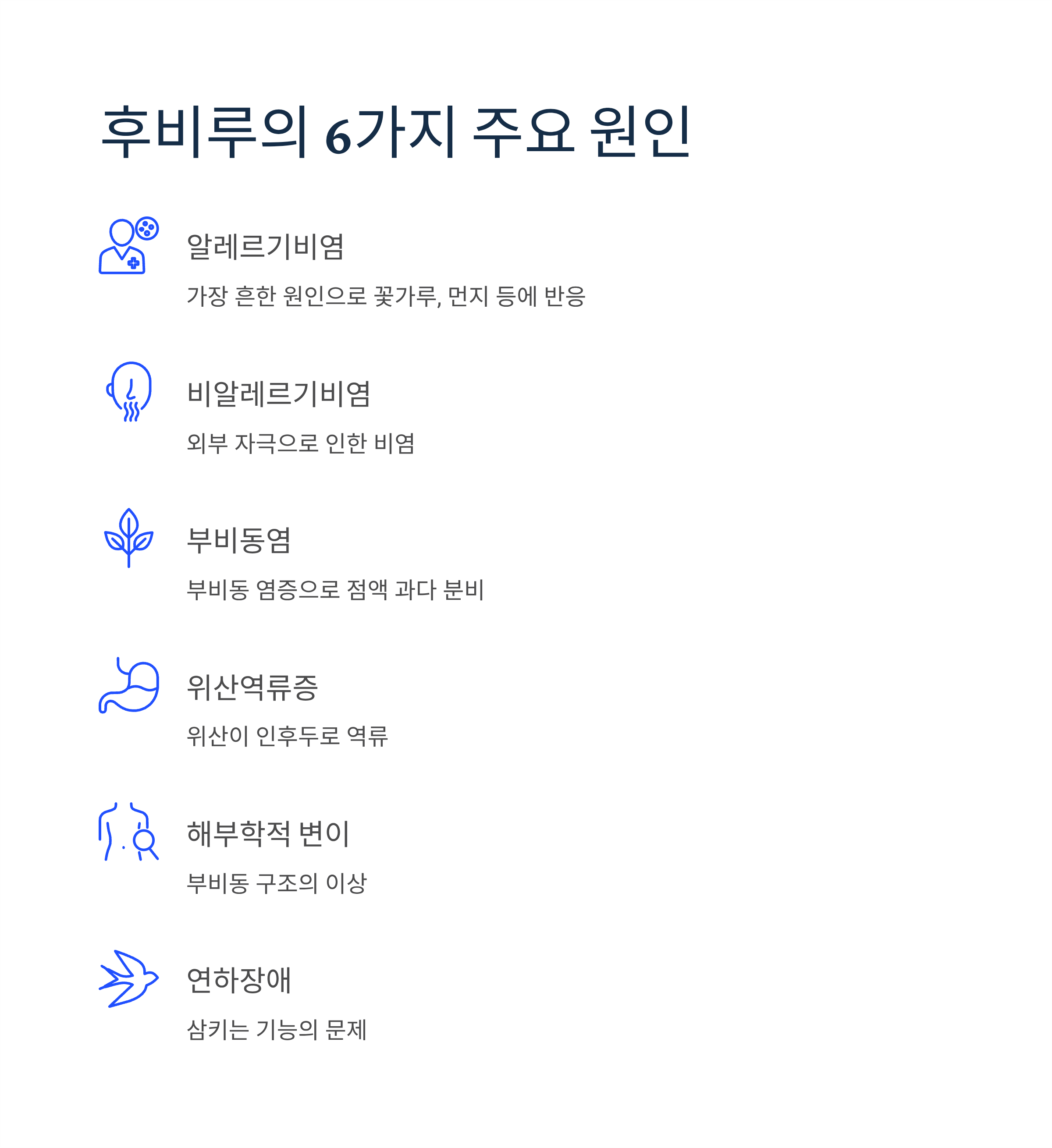 후비루를 발생시키는 주요 원인은 알레르기비염, 비알레르기비염, 부비동염, 인후두 위산역류증, 부비동 자연공의 해부학적 변이, 연하장애 등이 있습니다.