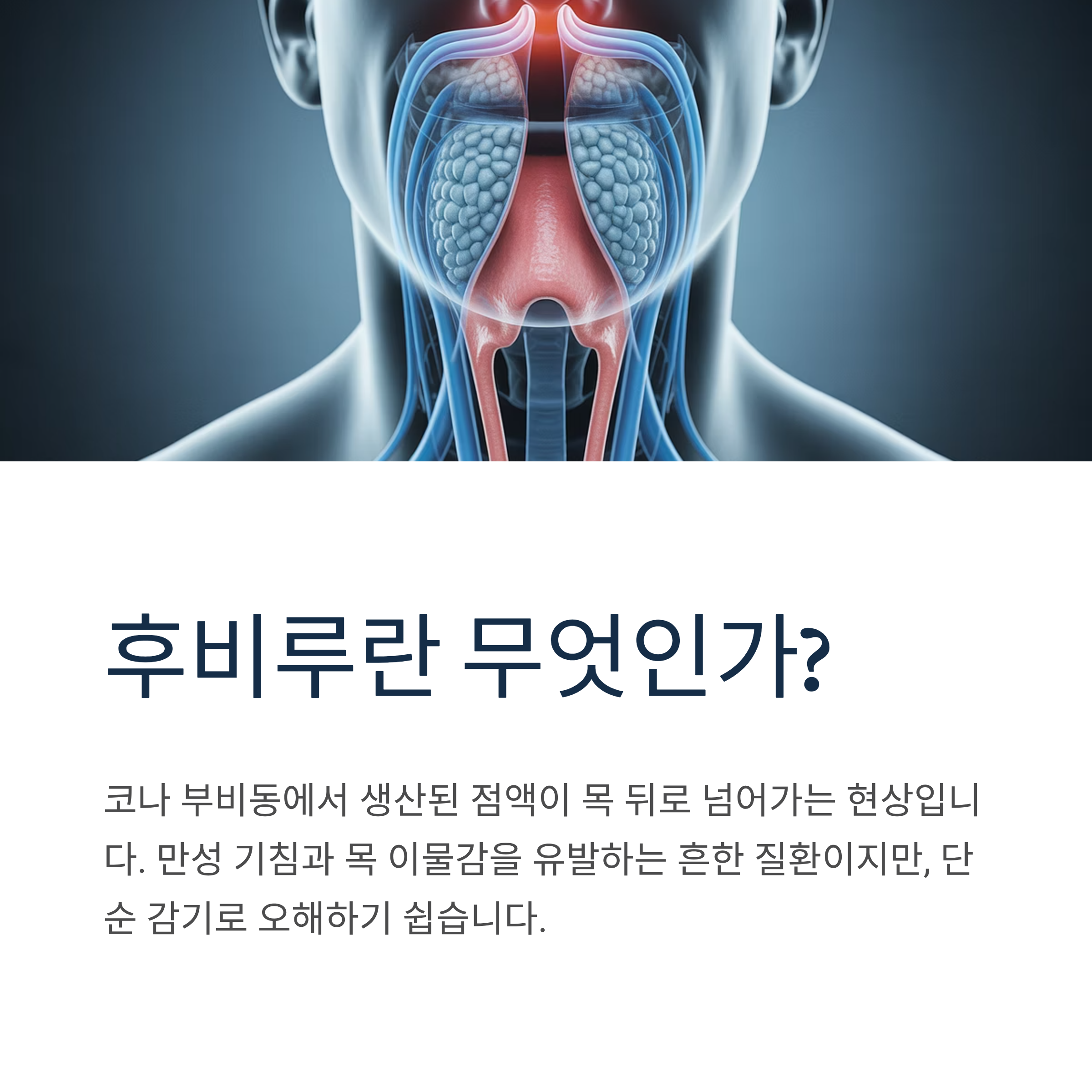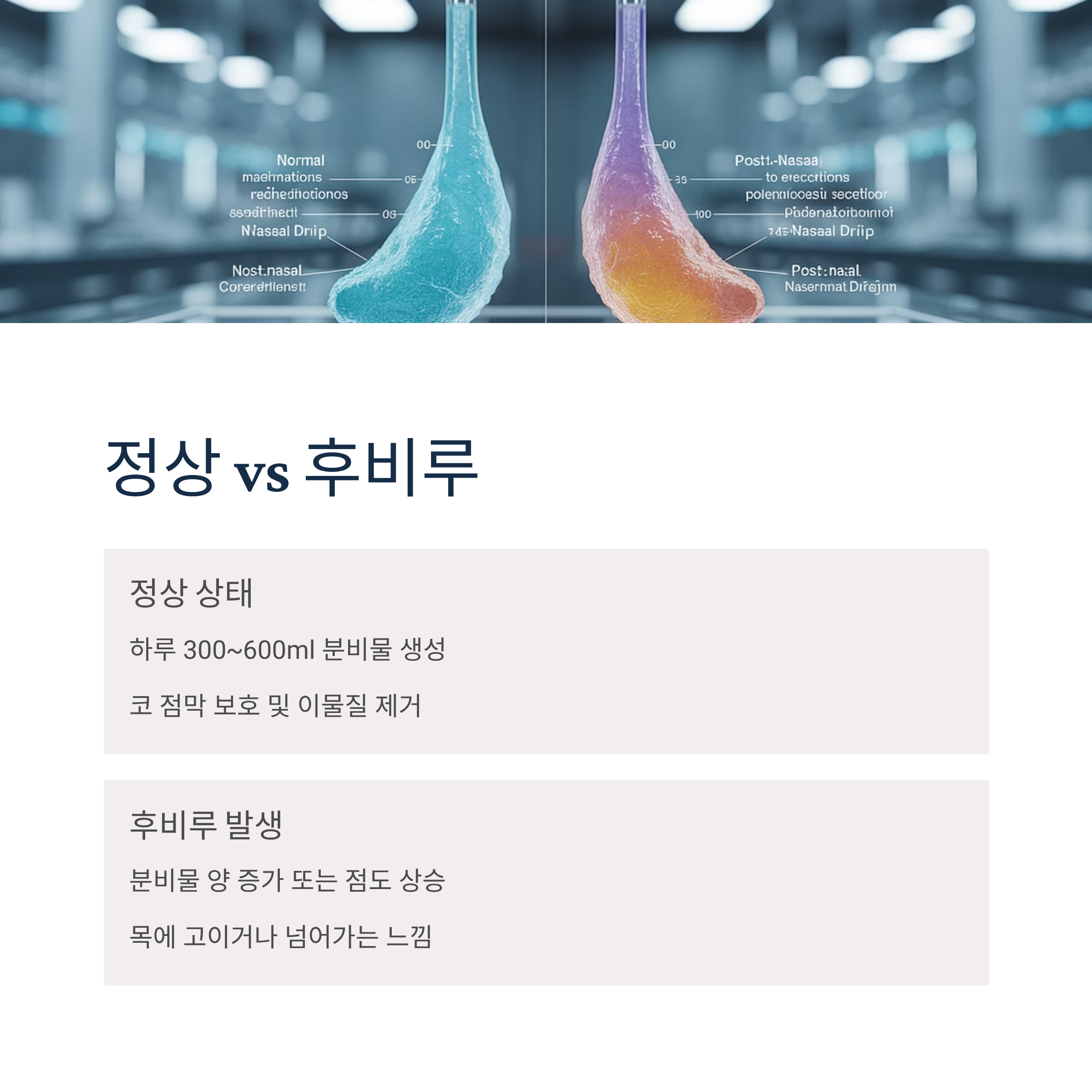 목으로 콧물이 넘어가는 불편함, 밤마다 계속되는 기침으로 힘드시다면 더 이상 참지 마세요. 정확한 진단과 원인별 맞춤 치료로 후비루 증상에서 해방될 수 있습니다.
