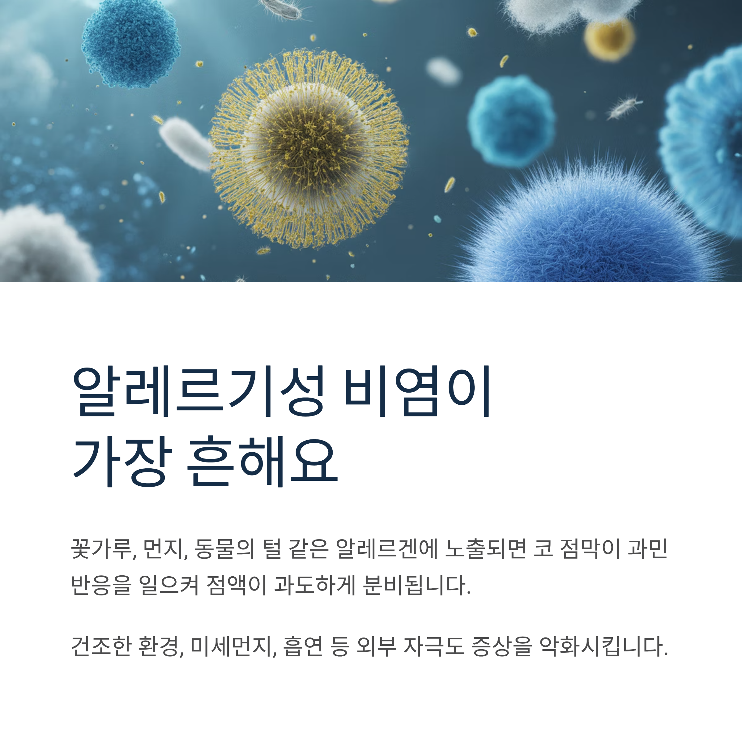 알레르기성 비염이 가장 흔한 원인으로, 꽃가루, 먼지, 동물의 털 같은 알레르겐에 노출되면 코 점막이 과민 반응을 일으켜 점액이 과도하게 분비됩니다. 또한 건조한 환경, 미세먼지, 흡연 등 외부 자극도 증상을 악화시킵니다.