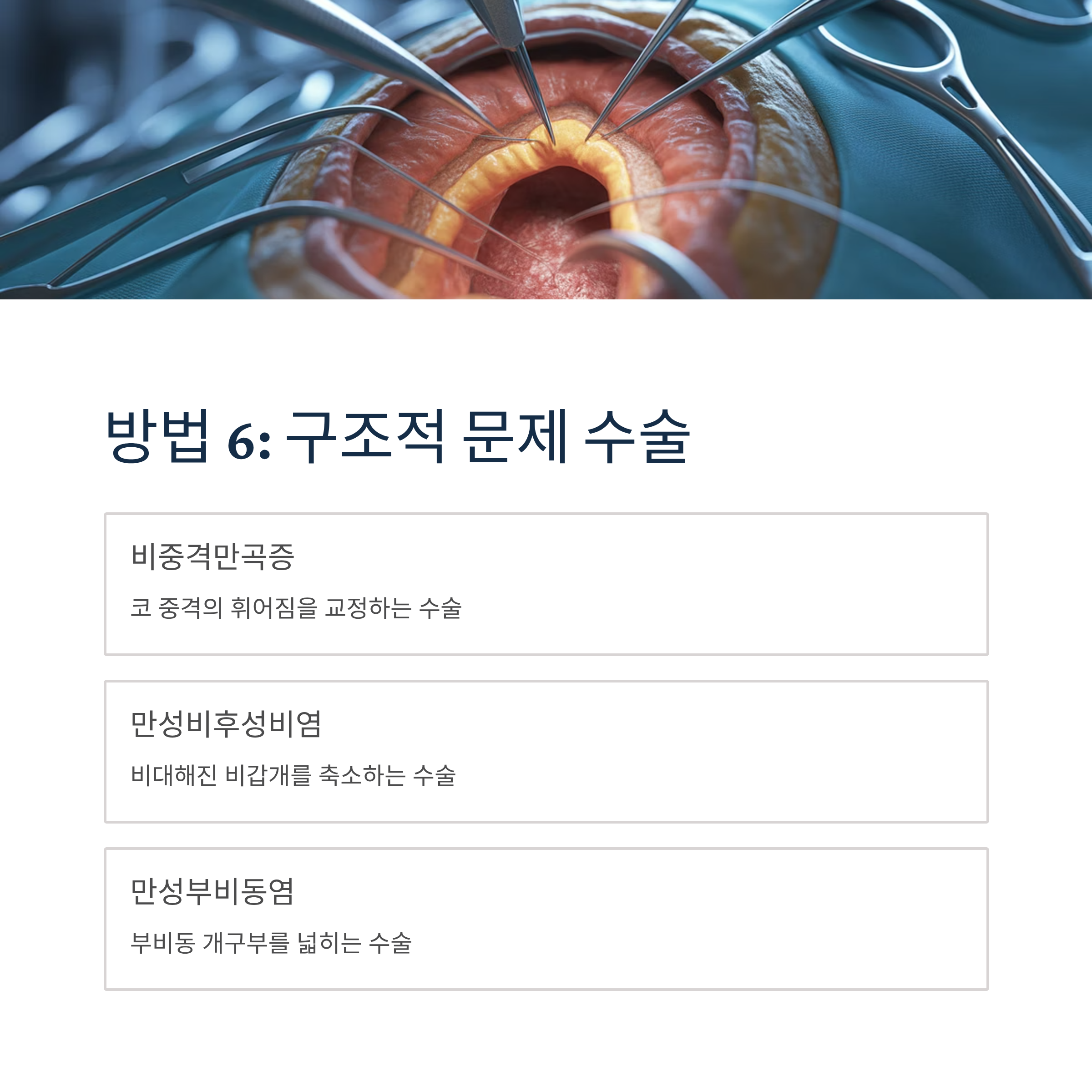 비중격만곡증과 만성비후성비염 같은 구조적 문제는 수술을 통해 치료하며, 만성부비동염도 수술이 필요할 수 있습니다.