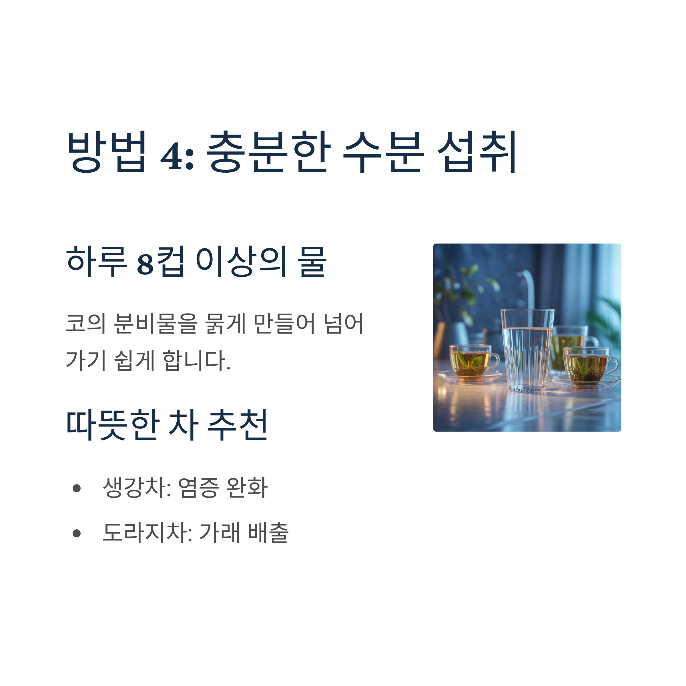 하루 8컵 이상의 물을 마셔 코의 분비물을 묽게 만들어 넘어가기 쉽게 해야 합니다. 따뜻한 생강차나 도라지차는 염증 완화와 가래 배출에 도움이 됩니다.