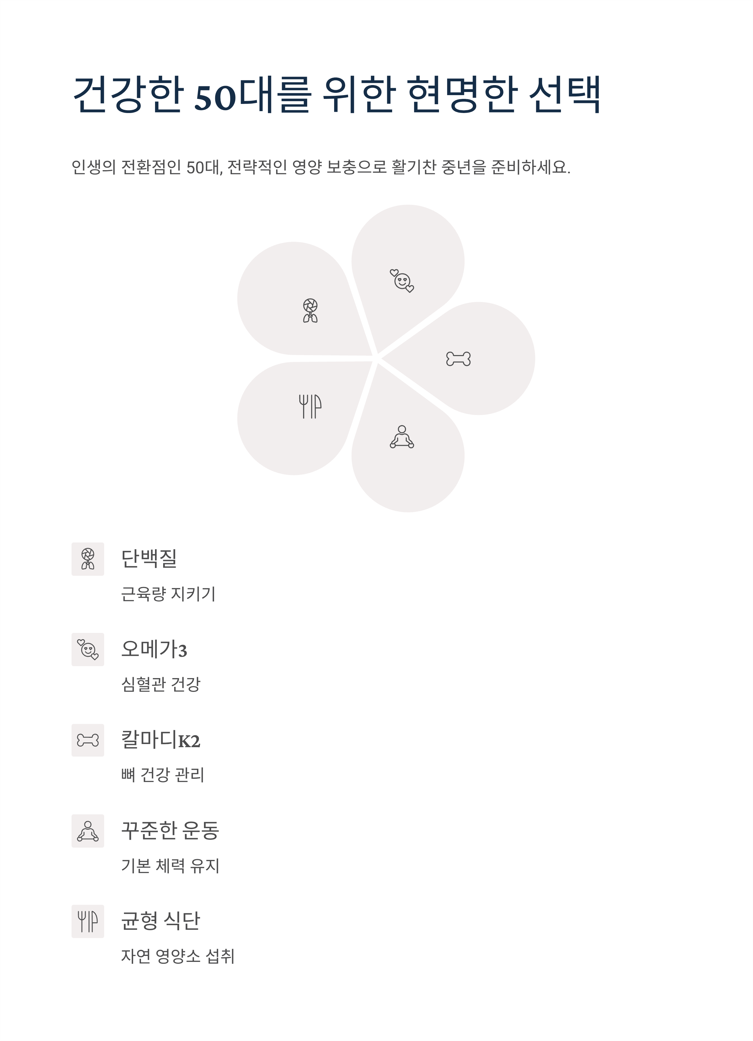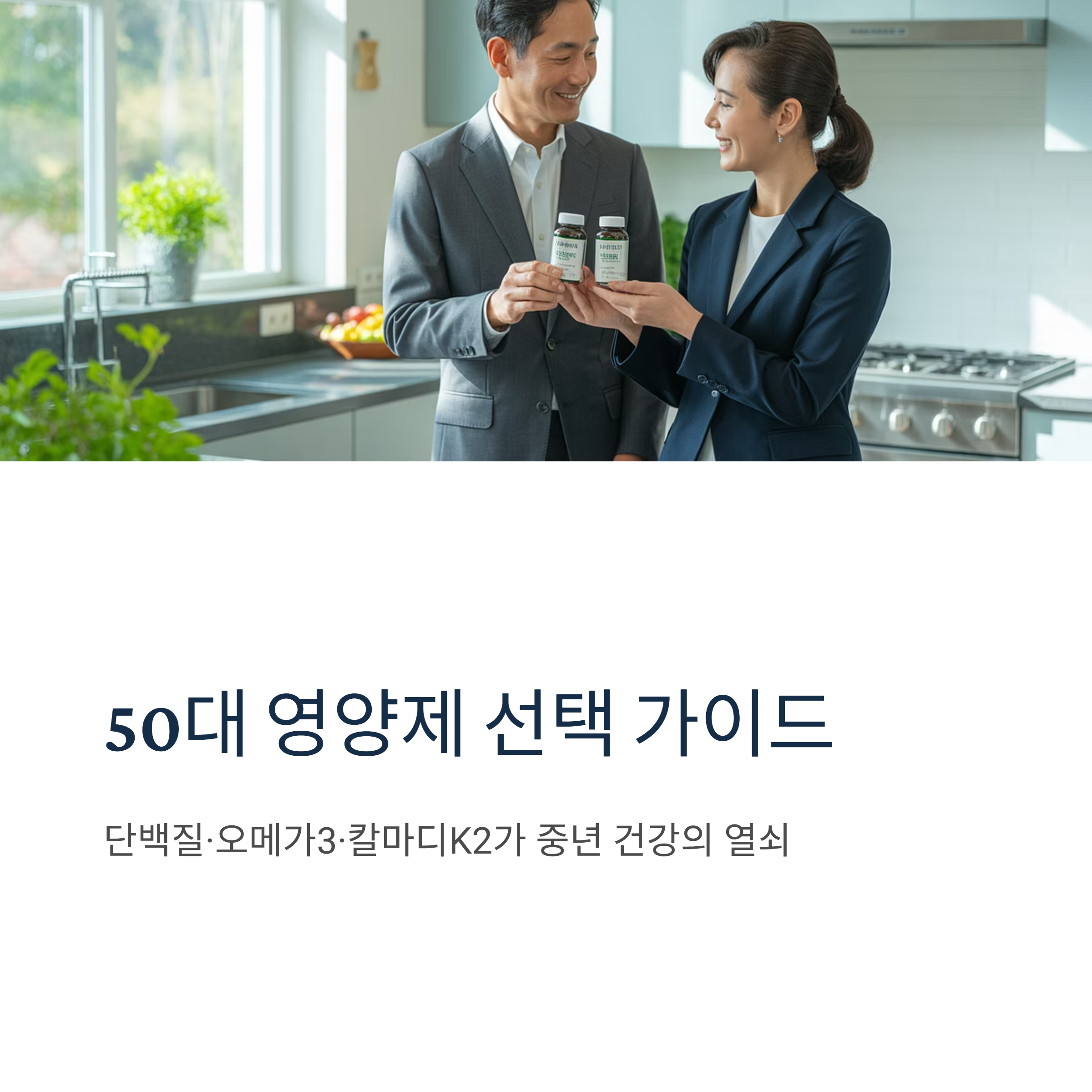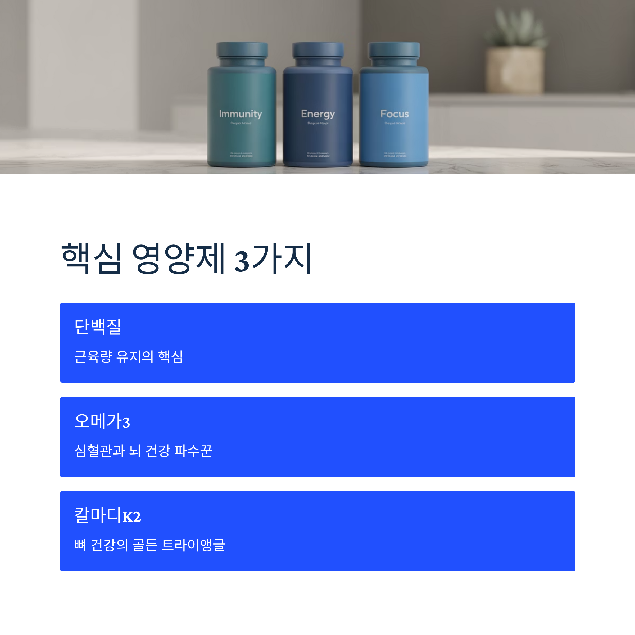 50대는 인생의 전환점입니다. 젊었을 때의 건강 저금이 바닥나기 전에 전략적인 영양 보충이 필요한 시기입니다. 단백질로 근육량을 지키고, 오메가3로 심혈관 건강을 챙기며, 칼마디K2 조합으로 뼈 건강까지 관리한다면 활기찬 중년과 건강한 노년을 준비할 수 있습니다.