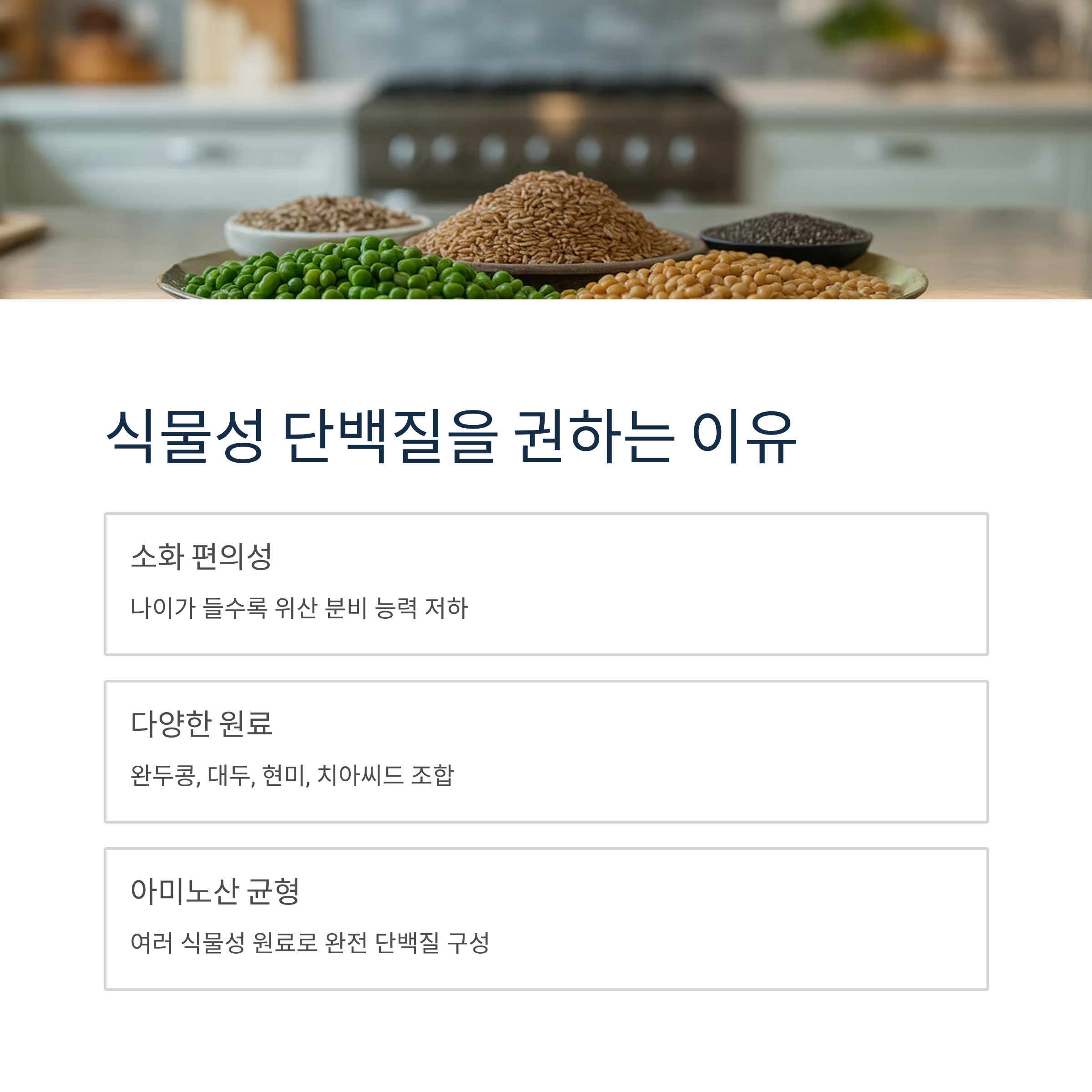 나이가 들수록 위산 분비 능력이 떨어지기 때문에 소화적인 측면에서 동물성보다는 식물성 단백질이 편합니다. 최근 식물성 단백질 제품은 완두콩, 대두와 함께 현미나 치아씨드 등 여러 식물성 원료를 조합하여 아미노산 균형을 맞춘 제품들이 많아졌습니다.