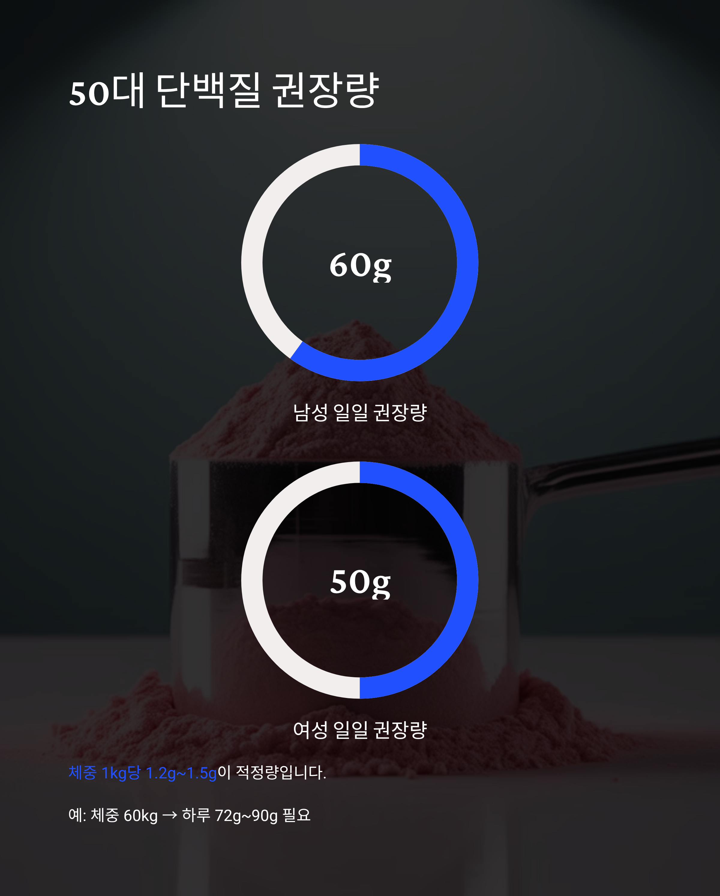 50대 남성은 하루 60g, 여성은 하루 50g 이상의 단백질 섭취가 권장되며, 체중 1kg당 1.2g~1.5g 정도가 적정량입니다. 예를 들어 체중 60kg인 경우 하루 최소 72g에서 최대 90g의 단백질이 필요합니다.