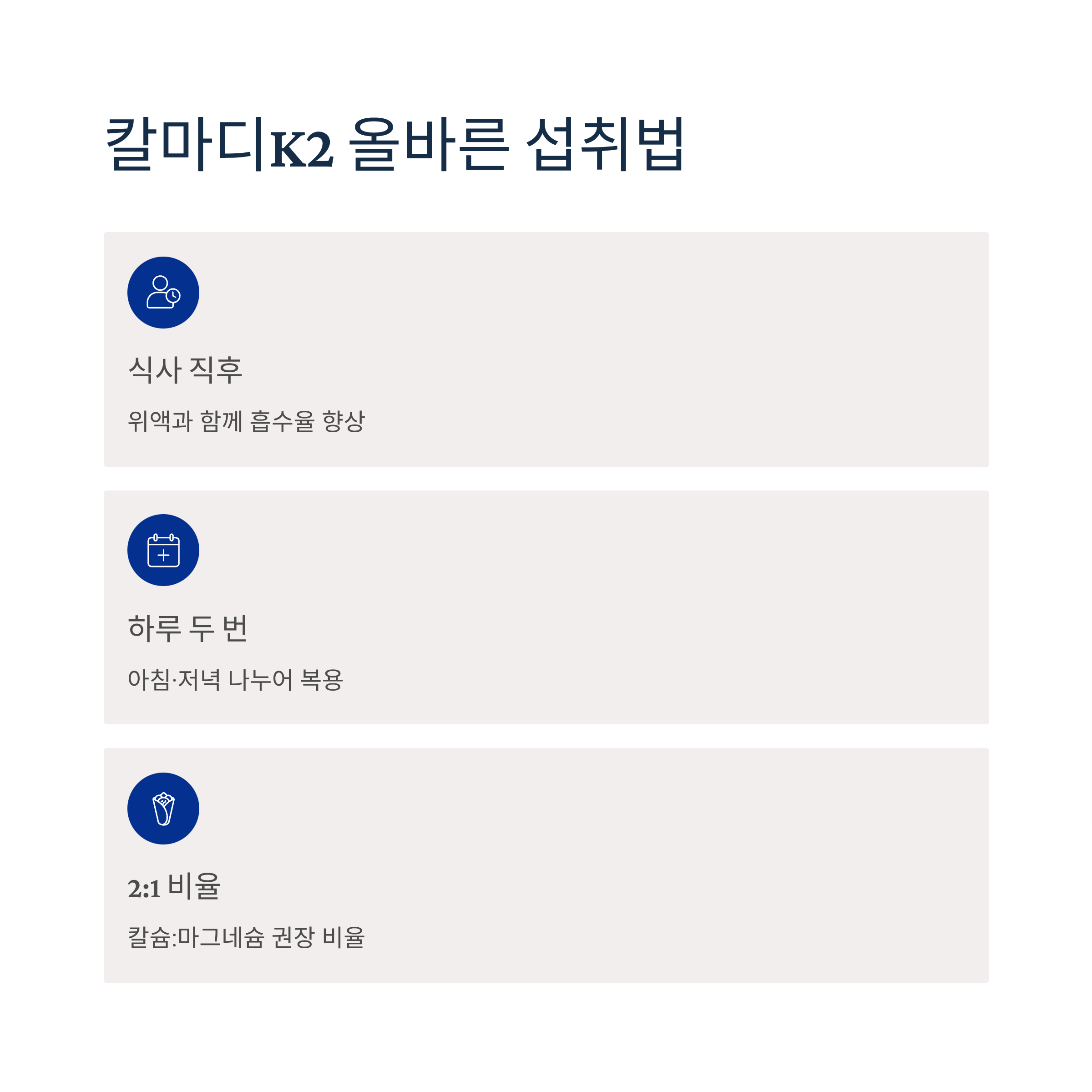 - 오메가3 (지방 많은 식사 후), 칼슘+마그네슘+비타민K2
