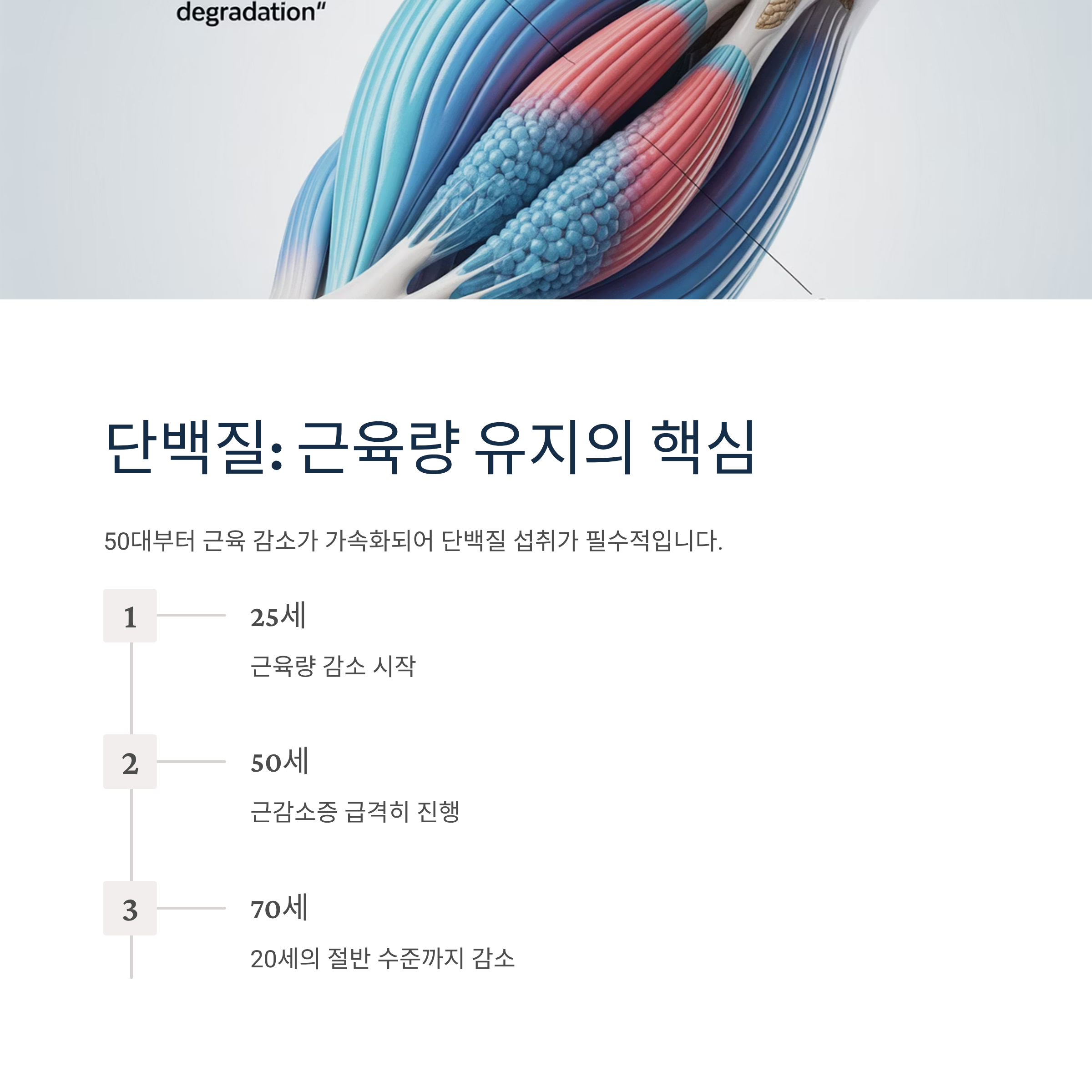 50대부터는 근육 감소가 가속화되기 때문에 단백질 섭취가 필수적입니다. 근육은 일반적으로 25세부터 매년 1∼2%씩 감소하기 시작해 70대가 되면 20세의 절반 수준에 이르게 됩니다.