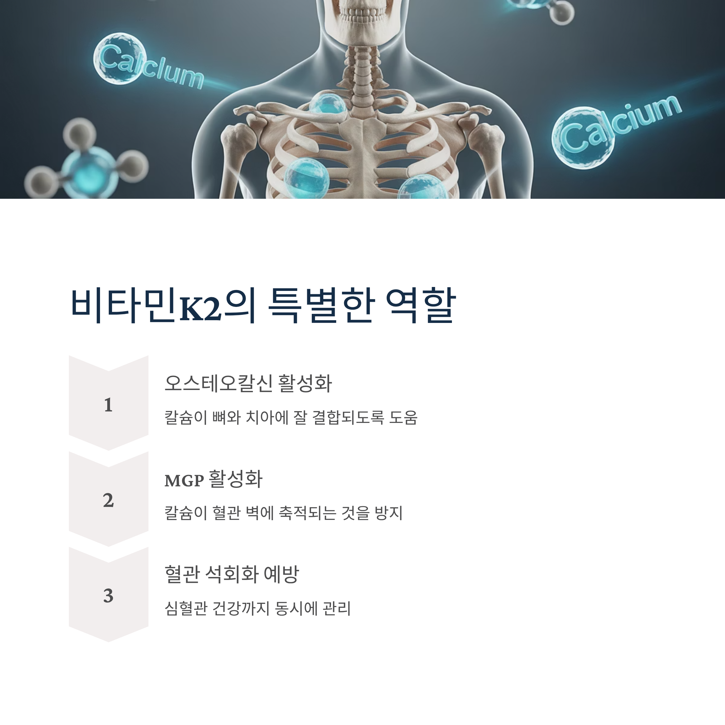 비타민K2는 오스테오칼신을 활성화해 칼슘이 뼈와 치아에 잘 결합되도록 하고, MGP(Matrix Gla Protein)를 활성화해 칼슘이 혈관 벽에 축적되는 것을 방지합니다.