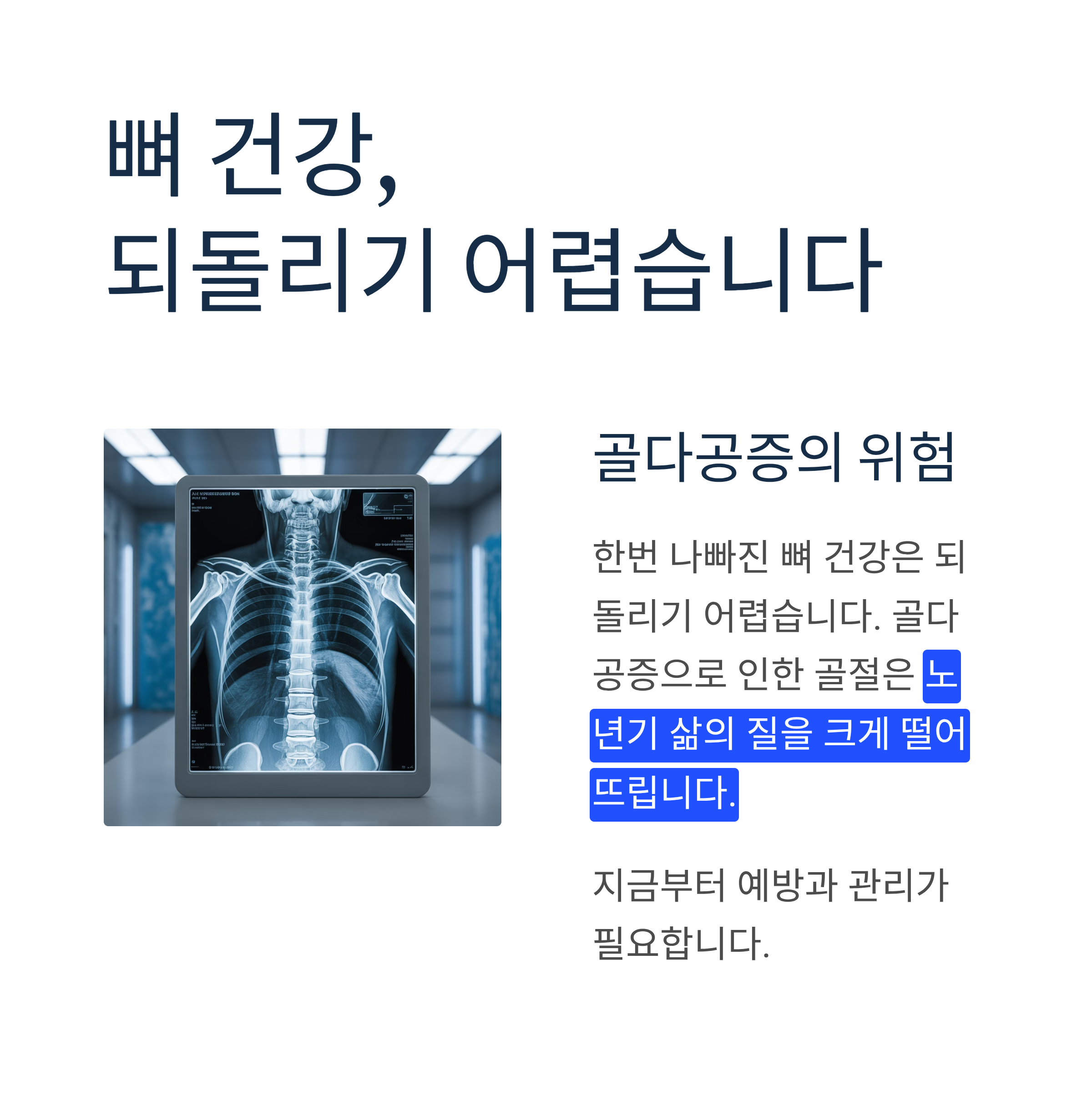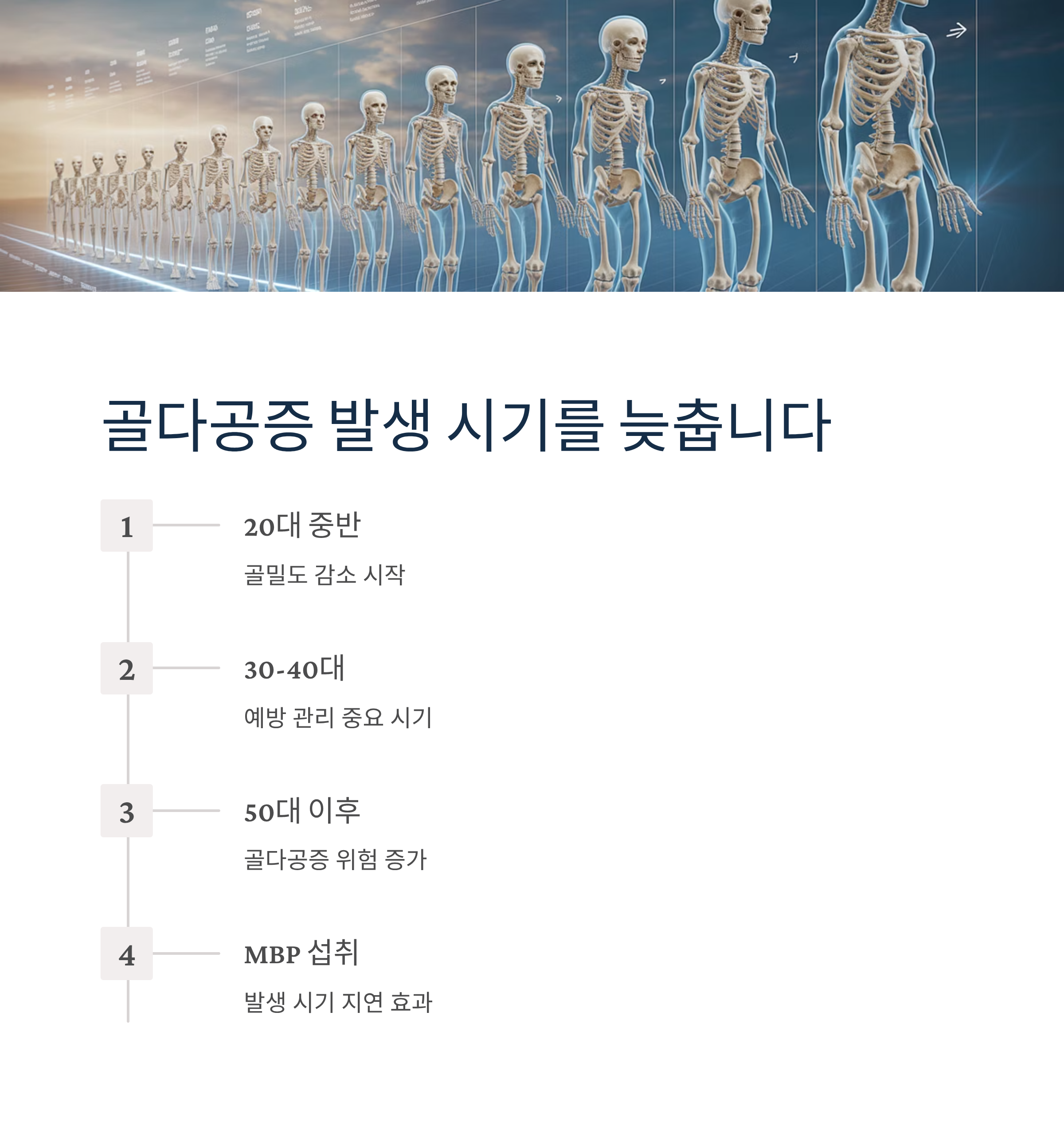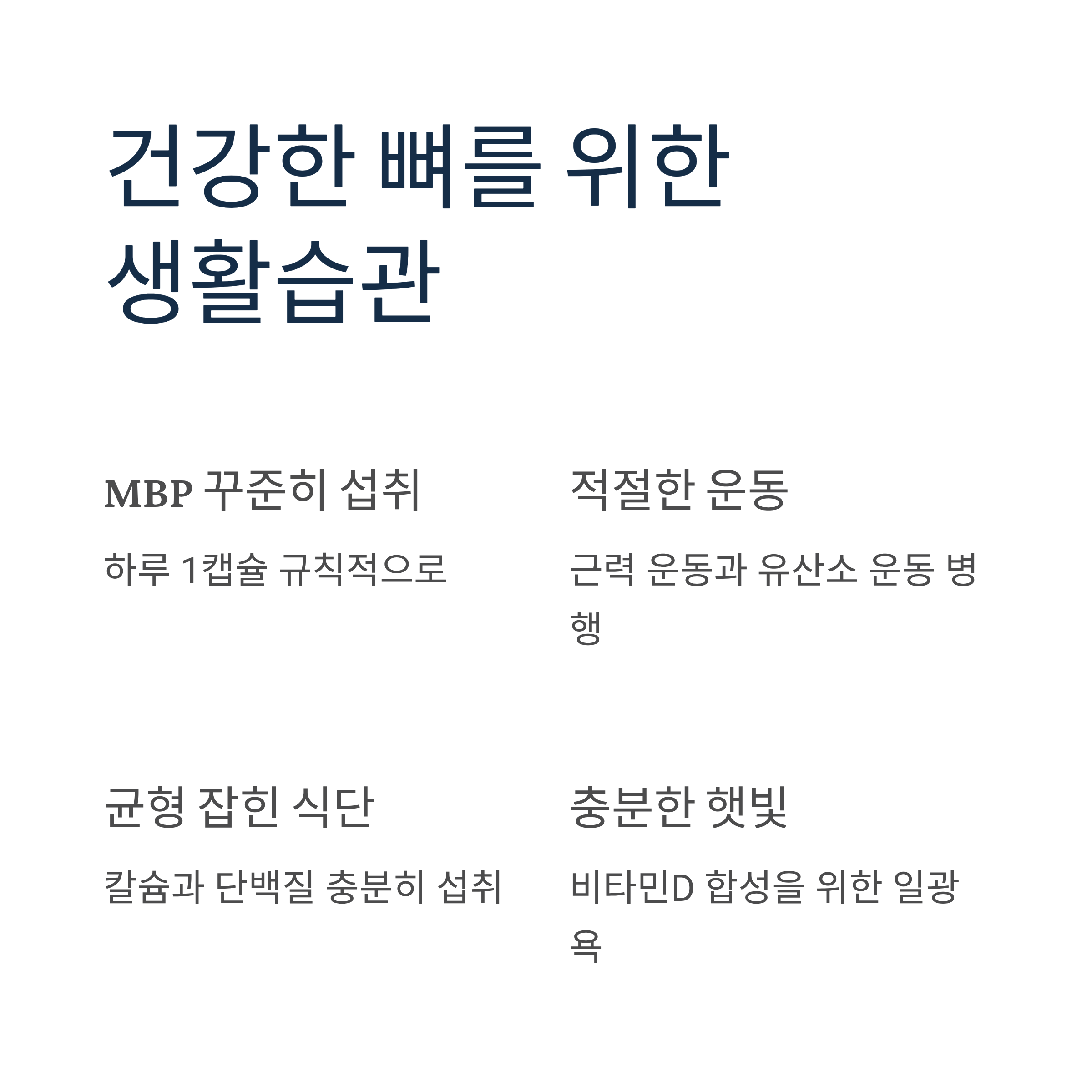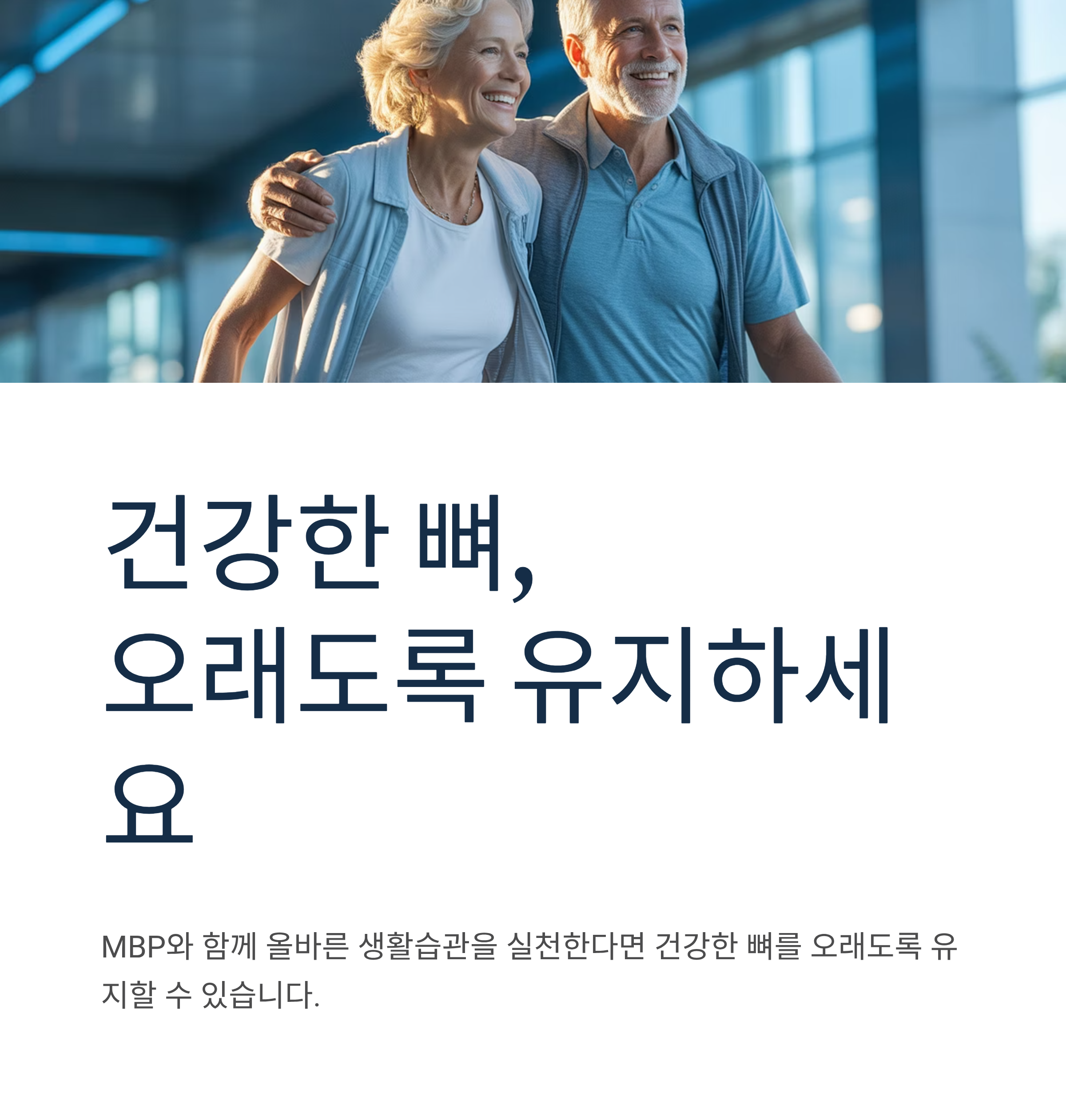 뼈 건강은 한번 나빠지면 되돌리기 어렵습니다. 골다공증으로 인한 골절은 노년기 삶의 질을 크게 떨어뜨릴 수 있습니다. MBP와 함께 적절한 운동, 균형 잡힌 식단, 충분한 햇빛 노출을 병행한다면 건강한 뼈를 오래도록 유지할 수 있습니다.