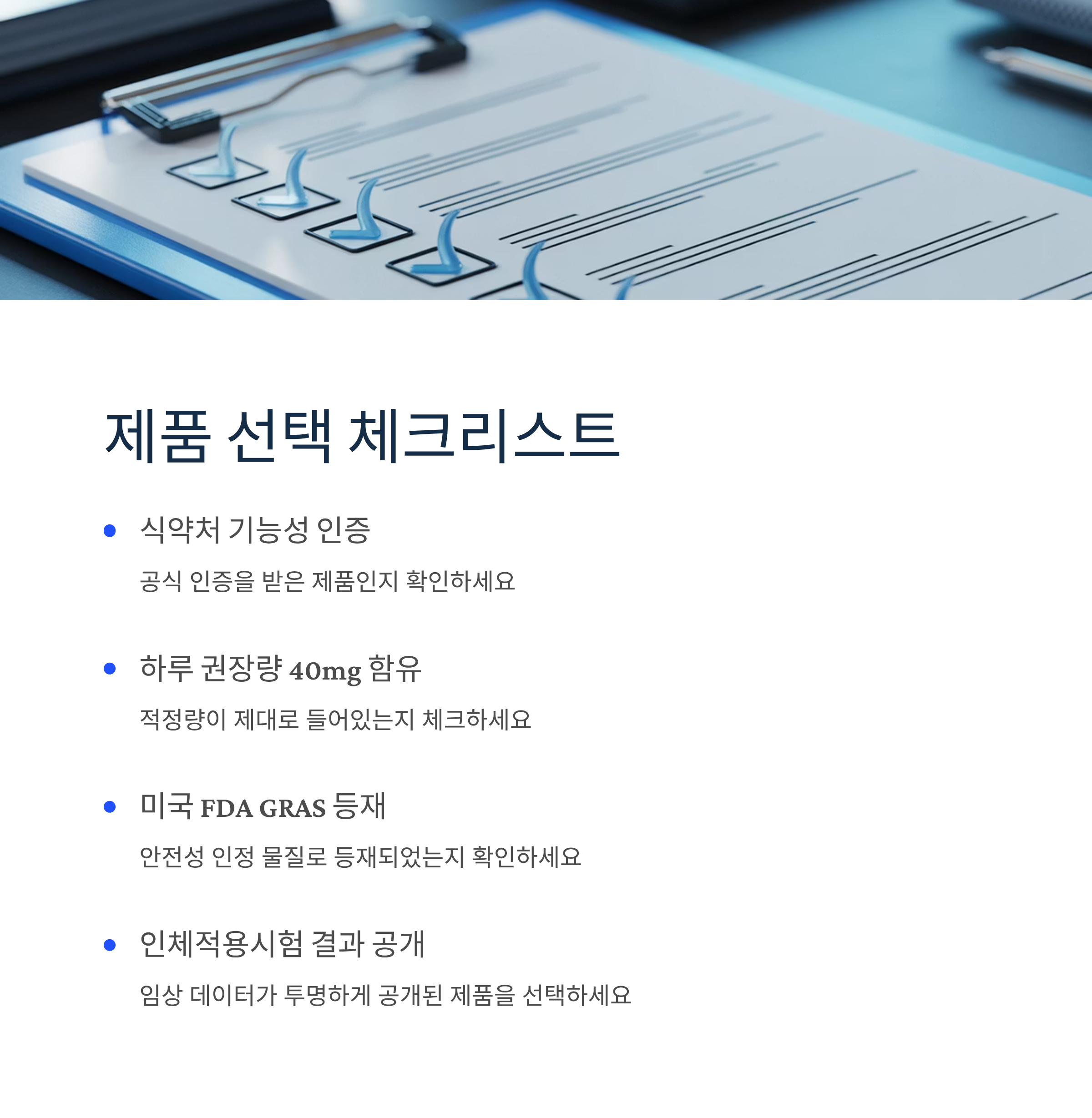 ✅ 선택 체크리스트: ① 식약처 기능성 인증 여부 ② 하루 권장량 40mg 함유 ③ FDA GRAS 등재 확인 ④ 인체적용시험 결과 공개 ⑤ 락토페린 23.2mg 함유