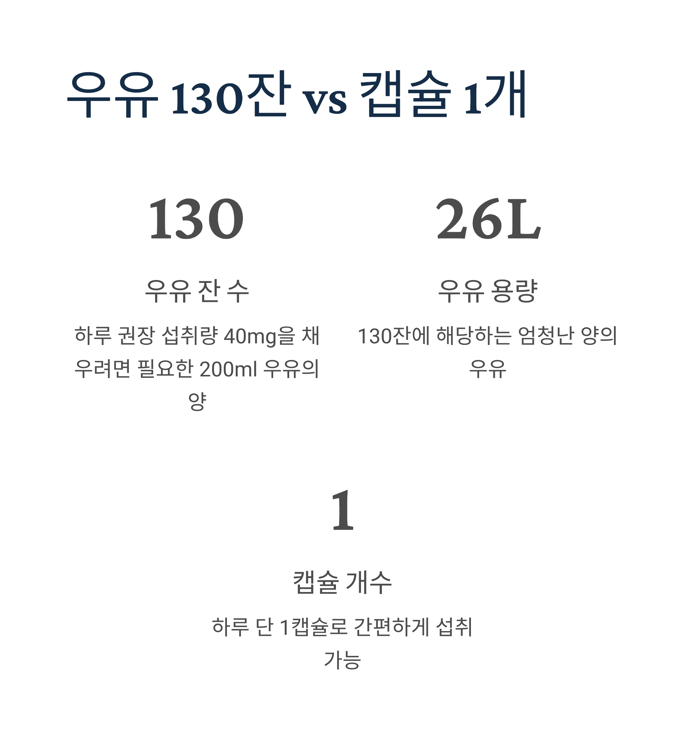 우유 130잔을 마실 필요 없이 하루 1캡슐로 필요한 양을 섭취할 수 있습니다. 130mg의 작은 캡슐로 목 넘김이 쉽고, 무미·무취라 부담 없이 꾸준히 복용할 수 있습니다.