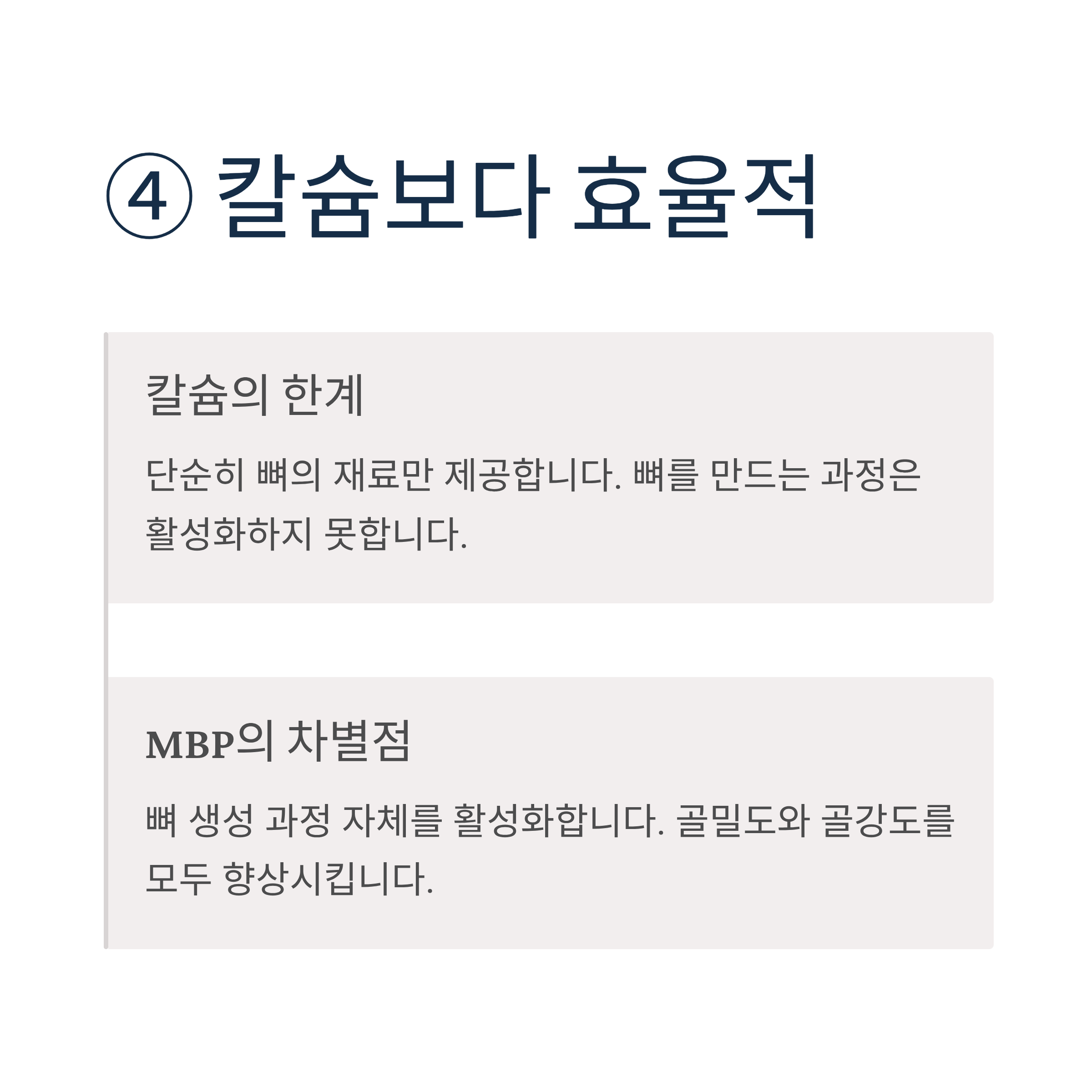 칼슘은 단순히 뼈의 재료만 제공하지만, MBP는 뼈 생성 과정 자체를 활성화합니다. 골밀도와 골강도를 모두 향상시키는 메커니즘으로 작용하여, 칼슘 단독 섭취보다 더 효과적인 뼈 건강 관리가 가능합니다.